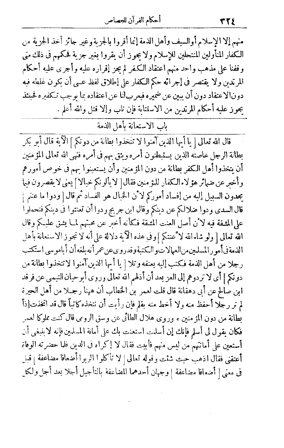 قَالَ اللَّهُ تَعَالَى يَا أَيُّهَا الَّذِينَ آمَنُوا لا تَتَّخِذُوا بِطانَةً مِنْ دُونِكُمْ الْآيَةَ قَالَ أَبُو بَكْرٍ بِطَانَةُ الرَّجُلِ خَاصَّتُهُ الذين يستبطنون أَمْرَهُ وَيَثِقُ بِهِمْ فِي أَمْرِهِ فَنَهَى اللَّهُ تَعَالَى الْمُؤْمِنِينَ أَنْ يَتَّخِذُوا أَهْلَ الْكُفْرِ بِطَانَةً مِنْ دُونِ الْمُؤْمِنِينَ وَأَنْ يَسْتَعِينُوا بِهِمْ فِي خوص أُمُورِهِمْ وَأَخْبَرَ عَنْ ضَمَائِرِ هَؤُلَاءِ الْكُفَّارِ لِلْمُؤْمِنِينَ فقال لا يَأْلُونَكُمْ خَبالًا يَعْنِي لَا يُقَصِّرُونَ فِيمَا يَجِدُونَ السَّبِيلَ إلَيْهِ مِنْ إفْسَادِ أُمُورِكُمْ لِأَنَّ الْخَبَالَ هُوَ الْفَسَادُ ثم قال وَدُّوا ما عَنِتُّمْ قَالَ السُّدِّيُّ وَدُّوا ضَلَالَكُمْ عَنْ دِينِكُمْ وَقَالَ ابْنُ جُرَيْجٍ وَدُّوا أَنْ تَعَنَّتُوا فِي دِينِكُمْ فَتَحْمِلُوا عَلَى الْمَشَقَّةِ فِيهِ لِأَنَّ أَصْلَ الْعَنَتِ الْمَشَقَّةُ فَكَأَنَّهُ أَخْبَرَ عَنْ مَحَبَّتِهِمْ لِمَا يَشُقُّ عَلَيْكُمْ وَقَالَ اللَّهُ تَعَالَى وَلَوْ شاءَ اللَّهُ لَأَعْنَتَكُمْ وَفِي هَذِهِ الْآيَةِ دَلَالَةٌ عَلَى أَنَّهُ لَا تَجُوزُ الِاسْتِعَانَةُ بِأَهْلِ الذِّمَّةِ فِي أُمُورِ الْمُسْلِمِينَ مِنْ الْعِمَالَاتِ وَالْكَتَبَةِ وَقَدْ رُوِيَ عَنْ عُمَرَ أَنَّهُ بَلَغَهُ أَنَّ أَبَا مُوسَى اسْتَكْتَبَ رَجُلًا مِنْ أَهْلِ الذِّمَّةِ فَكَتَبَ إلَيْهِ يُعَنِّفُهُ وَتَلَا يَا أَيُّهَا الَّذِينَ آمَنُوا لا تَتَّخِذُوا بِطانَةً مِنْ دُونِكُمْ أَيْ لَا تَرُدُّوهُمْ إلَى الْعِزِّ بَعْدَ أَنَّ أَذَلَّهُمْ اللَّهُ تَعَالَى وَرَوَى أَبُو حَيَّانَ التَّيْمِيُّ عن فرقد ابن صَالِحٍ عَنْ أَبِي دُهْقَانَةَ قَالَ قُلْت لِعُمَرَ بن الخطاب أن هاهنا رَجُلًا مِنْ أَهْلِ الْحِيرَةِ لَمْ نَرَ رَجُلًا أَحْفَظَ مِنْهُ وَلَا أَخَطَّ مِنْهُ بِقَلَمٍ فَإِنْ رأيت أن نتخذه كَاتِبًا قَالَ قَدْ اتَّخَذْتُ إذًا بِطَانَةً مِنْ دُونِ الْمُؤْمِنِينَ وَرَوَى هِلَالُ الطَّائِيُّ عَنْ وَسْقٍ الرُّومِيِّ قَالَ كُنْت مَمْلُوكًا لِعُمَرَ فَكَانَ يَقُولُ لِي أَسْلِمْ فَإِنَّك إنْ أَسْلَمَتْ اسْتَعَنْتُ بِك عَلَى أَمَانَةِ الْمُسْلِمِينَ فَإِنَّهُ لَا يَنْبَغِي أَنْ أَسْتَعِينَ عَلَى أَمَانَتِهِمْ مَنْ لَيْسَ مِنْهُمْ فَأَبَيْت فَقَالَ لَا إكْرَاهَ فِي الدِّينِ فَلَمَّا حَضَرَتْهُ الْوَفَاةُ أَعْتَقَنِي فَقَالَ اذْهَبْ حَيْثُ شِئْتَ وقَوْله تعالى لا تَأْكُلُوا الرِّبَوا أَضْعافاً مُضاعَفَةً قيل في معنى أَضْعافاً مُضاعَفَةً وَجْهَانِ أَحَدُهُمَا الْمُضَاعَفَةُ بِالتَّأْجِيلِ أَجَلًا بَعْدَ أَجَلٍ ولكل