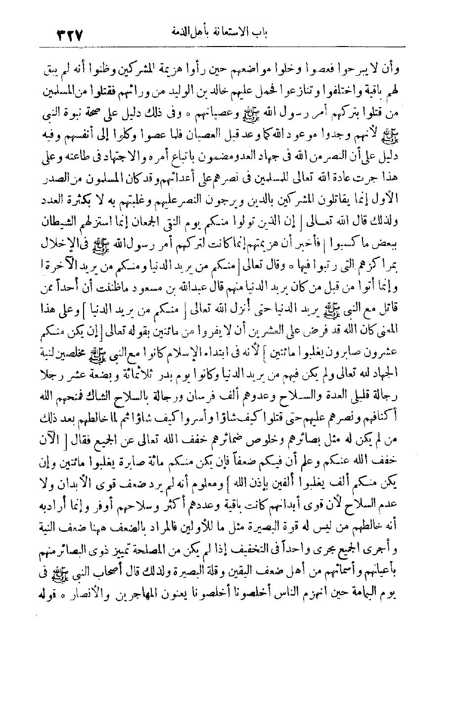وَقَالَ تَعَالَى مِنْكُمْ مَنْ يُرِيدُ الدُّنْيا وَمِنْكُمْ مَنْ يُرِيدُ الْآخِرَةَ وَإِنَّمَا أُتُوا مِنْ قَبْلُ مَنْ كَانَ يُرِيدُ الدُّنْيَا مِنْهُمْ قَالَ عَبْدُ اللَّهِ بْنُ مَسْعُودٍ مَا ظَنَنْت أَنَّ أَحَدًا مِمَّنْ قَاتَلَ مَعَ النَّبِيِّ صَلَّى اللَّهُ عَلَيْهِ وَسَلَّمَ يُرِيدُ الدُّنْيَا حَتَّى أَنْزَلَ اللَّهُ تَعَالَى مِنْكُمْ مَنْ يُرِيدُ الدُّنْيا وَعَلَى هَذَا الْمَعْنَى كَانَ اللَّهُ قَدْ فَرَضَ عَلَى الْعِشْرِينَ أَنْ لَا يَفِرُّوا مِنْ مِائَتَيْنِ بِقَوْلِهِ تَعَالَى إِنْ يَكُنْ مِنْكُمْ عِشْرُونَ صابِرُونَ يَغْلِبُوا مِائَتَيْنِ لِأَنَّهُ فِي ابْتِدَاءِ الْإِسْلَامِ كَانُوا مَعَ النَّبِيِّ صَلَّى اللَّهُ عَلَيْهِ وَسَلَّمَ مُخْلِصِينَ لِنِيَّةِ الْجِهَادِ لِلَّهِ تَعَالَى وَلَمْ يَكُنْ فِيهِمْ مَنْ يُرِيدُ الدُّنْيَا وَكَانُوا يَوْمَ بَدْرٍ ثَلَاثَمِائَةٍ وَبِضْعَةَ عَشَرَ رَجُلًا رَجَّالَةً قَلِيلِي الْعُدَّةِ وَالسِّلَاحِ وَعَدُوُّهُمْ أَلْفٌ فُرْسَانٌ وَرَجَّالَةٌ بِالسِّلَاحِ الشَّاكِّ فَمَنَحَهُمْ اللَّهُ أَكْتَافَهُمْ وَنَصَرَهُمْ عَلَيْهِمْ حَتَّى قَتَلُوا كَيْفَ شَاءُوا وَأَسَرُوا كَيْفَ شَاءُوا ثُمَّ لَمَّا خَالَطَهُمْ بَعْدَ ذَلِكَ مَنْ لَمْ يَكُنْ لَهُ مِثْلُ بَصَائِرِهِمْ وَخُلُوصُ ضَمَائِرِهِمْ خَفَّفَ اللَّهُ تَعَالَى عَنْ الْجَمِيعِ فَقَالَ الْآنَ خَفَّفَ اللَّهُ عَنْكُمْ وَعَلِمَ أَنَّ فِيكُمْ ضَعْفاً فَإِنْ يَكُنْ مِنْكُمْ مِائَةٌ صابِرَةٌ يَغْلِبُوا مِائَتَيْنِ وَإِنْ يَكُنْ مِنْكُمْ أَلْفٌ يَغْلِبُوا أَلْفَيْنِ بِإِذْنِ اللَّهِ وَمَعْلُومٌ أَنَّهُ لَمْ يُرِدْ ضَعْفَ قُوَى الْأَبْدَانِ وَلَا عَدَمَ السِّلَاحِ لِأَنَّ قُوَى أَبْدَانِهِمْ كَانَتْ بَاقِيَةً وَعَدَدُهُمْ أَكْثَرُ وَسِلَاحُهُمْ أَوْفَرُ وَإِنَّمَا أَرَادَ بِهِ أَنَّهُ خَالَطَهُمْ مَنْ لَيْسَ لَهُ قُوَّةُ البصيرة مثل ما للأولين فالمراد بالضعف هاهنا ضَعْفُ النِّيَّةِ وَأَجْرَى الْجَمِيعَ مَجْرًى وَاحِدًا فِي التخفيف إذا لَمْ يَكُنْ مِنْ الْمَصْلَحَةِ تَمْيِيزُ ذَوِي الْبَصَائِرِ مِنْهُمْ بِأَعْيَانِهِمْ وَأَسْمَائِهِمْ مِنْ أَهْلِ ضَعْفِ الْيَقِينِ وَقِلَّةِ الْبَصِيرَةِ وَلِذَلِكَ قَالَ أَصْحَابُ النَّبِيِّ صَلَّى الله عليه وسلّم في يوم القيامة حِينَ انْهَزَمَ النَّاسُ أَخْلِصُونَا أَخْلِصُونَا يَعْنُونَ الْمُهَاجِرِينَ والأنصار