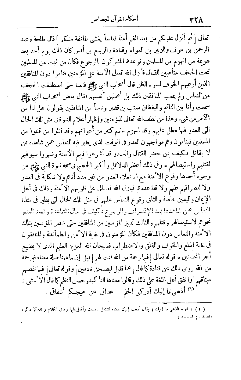 تَعَالَى ثُمَّ أَنْزَلَ عَلَيْكُمْ مِنْ بَعْدِ الْغَمِّ أَمَنَةً نُعاساً يَغْشى طائِفَةً مِنْكُمْ قَالَ طَلْحَةُ وَعَبْدُ الرَّحْمَنِ بْنُ عَوْفٍ وَالزُّبَيْرُ بْنُ الْعَوَامّ وَقَتَادَةُ وَالرَّبِيعُ بْنُ أَنَسٍ كَانَ ذَلِكَ يَوْمَ أُحُدٍ بَعْدَ هَزِيمَةِ مَنْ انْهَزَمَ مِنْ الْمُسْلِمِينَ وَتَوَعَّدَهُمْ الْمُشْرِكُونَ بِالرُّجُوعِ فَكَانَ مَنْ ثَبَتَ مِنْ الْمُسْلِمِينَ تَحْتَ الْحُجُفِ مُتَأَهِّبِينَ لِلْقِتَالِ فَأَنْزَلَ اللَّهُ تَعَالَى الْأَمَنَةَ عَلَى الْمُؤْمِنِينَ فَنَامُوا دُونَ الْمُنَافِقِينَ الَّذِينَ أَرْعَبْهُمْ الْخَوْفُ لِسُوءِ الظَّنِّ قَالَ أَصْحَابُ النَّبِيِّ صَلَّى اللَّهُ عَلَيْهِ وَسَلَّمَ فَنِمْنَا حَتَّى اصْطَفَقَتْ الْحُجُفُ مِنْ النُّعَاسِ وَلَمْ يصب المنافقين ذلك بل أهمتهن أَنْفُسُهُمْ فَقَالَ بَعْضُ أَصْحَابِ النَّبِيِّ صَلَّى اللَّهُ عَلَيْهِ وَسَلَّمَ سَمِعْت وَأَنَا بَيْنَ النَّائِمِ وَالْيَقْظَانِ مُعَتِّبَ بْنَ قُشَيْرٍ وَنَاسًا مِنْ الْمُنَافِقِينَ يَقُولُونَ هَلْ لَنَا مِنْ الْأَمْرِ مِنْ شَيْءٍ وَهَذَا مِنْ لُطْفِ اللَّهِ تَعَالَى لِلْمُؤْمِنِينَ وَإِظْهَارِ أَعْلَامِ النُّبُوَّةِ فِي مِثْلِ تِلْكَ الْحَالِ الَّتِي الْعَدُوُّ فِيهَا مُطِلٌّ عَلَيْهِمْ وَقَدْ انْهَزَمَ عَنْهُمْ كَثِيرٌ مِنْ أَعْوَانِهِمْ وَقَدْ قَتَلُوا مَنْ قَتَلُوا مِنْ الْمُسْلِمِينَ فَيَنَامُونَ وَهُمْ مُوَاجِهُونَ الْعَدُوَّ فِي الْوَقْتِ الَّذِي يَطِيرُ فِيهِ النُّعَاسُ عَمَّنْ شَاهَدَهُ مِمَّنْ لَا يُقَاتِلُ فَكَيْفَ بِمَنْ حَضَرَ الْقِتَالَ وَالْعَدُوُّ قَدْ أَشَرَعُوا فِيهِمْ الْأَسِنَّةَ وَشَهَرُوا سُيُوفَهُمْ لِقَتْلِهِمْ وَاسْتِيصَالِهِمْ وَفِي ذَلِكَ أَعْظَمُ الدَّلَائِلِ وَأَكْبَرُ الْحِجَجِ فِي صِحَّةِ نُبُوَّةِ النَّبِيِّ صَلَّى اللَّهُ عَلَيْهِ وَسَلَّمَ مِنْ وُجُوهٍ أَحَدُهَا وُقُوعُ الْأَمَنَةِ مَعَ اسْتِعْلَاءِ الْعَدُوِّ مِنْ غَيْرِ مَدَدٍ آتَاهُمْ وَلَا نِكَايَةٍ فِي الْعَدُوِّ وَلَا انْصِرَافِهِمْ عَنْهُمْ وَلَا قِلَّةِ عَدَدِهِمْ فَيُنَزِّلُ اللَّهُ تَعَالَى عَلَى قُلُوبِهِمْ الْأَمَنَةَ وَذَلِكَ فِي أَهْلِ الْإِيمَانِ وَالْيَقِينِ خَاصَّةً وَالثَّانِي وُقُوعُ النُّعَاسِ عَلَيْهِمْ فِي مِثْلِ تِلْكَ الْحَالِ الَّتِي يَطِيرُ فِي مِثْلِهَا النُّعَاسُ عَمَّنْ شاهدها بعد الانصراف والرجوع فكيف في حَالُ الْمُشَاهَدَةِ وَقَصْدُ الْعَدُوِّ نَحْوَهُمْ لِاسْتِيصَالِهِمْ وَقَتْلِهِمْ وَالثَّالِثُ تَمْيِيزُ الْمُؤْمِنِينَ مِنْ الْمُنَافِقِينَ حَتَّى خَصَّ الْمُؤْمِنِينَ بِتِلْكَ الْأَمَنَةِ وَالنُّعَاسِ دُونَ الْمُنَافِقِينَ فَكَانَ الْمُؤْمِنُونَ فِي غَايَةِ الْأَمْنِ وَالطُّمَأْنِينَةِ وَالْمُنَافِقُونَ فِي غَايَةِ الْهَلَعِ وَالْخَوْفِ وَالْقَلَقِ وَالِاضْطِرَابِ فَسُبْحَانَ اللَّهِ الْعَزِيزِ الْعَلِيمِ الَّذِي لَا يُضِيعُ أَجْرَ الْمُحْسِنِينَ