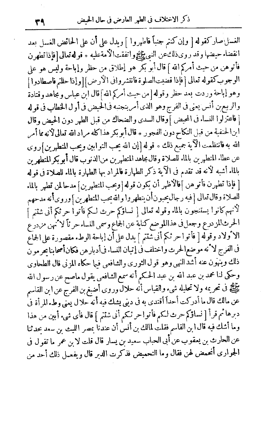 وَاتَّفَقَتْ الْأُمَّةُ عَلَيْهِ قَوْله تَعَالَى فَإِذا تَطَهَّرْنَ فَأْتُوهُنَّ مِنْ حَيْثُ أَمَرَكُمُ اللَّهُ قَالَ أَبُو بَكْرٍ هُوَ إطْلَاقٌ مِنْ حَظْرٍ وَإِبَاحَةٍ وَلَيْسَ هُوَ عَلَى الْوُجُوبِ كَقَوْلِهِ تَعَالَى فَإِذا قُضِيَتِ الصَّلاةُ فَانْتَشِرُوا فِي الْأَرْضِ وَإِذا حَلَلْتُمْ فَاصْطادُوا وَهُوَ إبَاحَةٌ وَرَدَتْ بَعْدَ حَظْرٍ وَقَوْلُهُ مِنْ حَيْثُ أَمَرَكُمُ اللَّهُ قَالَ ابْنُ عَبَّاسٍ وَمُجَاهِدٌ وَقَتَادَةُ وَالرَّبِيعُ بْنُ أَنَسٍ يَعْنِي فِي الْفَرْجِ وَهُوَ الَّذِي أَمَرَ بِتَجَنُّبِهِ فِي الْحَيْضِ فِي أَوَّلِ الْخِطَابِ فِي قوله فَاعْتَزِلُوا النِّساءَ فِي الْمَحِيضِ وَقَالَ السُّدِّيُّ وَالضَّحَّاكُ مِنْ قِبَلِ الطُّهْرِ دُونَ الْحَيْضِ وَقَالَ ابْنُ الْحَنَفِيَّةِ مِنْ قِبَلِ النِّكَاحِ دُونَ الْفُجُورِ قَالَ أَبُو بَكْرٍ هَذَا كُلُّهُ مُرَادُ اللَّهِ تَعَالَى لِأَنَّهُ مِمَّا أَمَرَ اللَّهُ بِهِ فَانْتَظَمَتْ الْآيَةُ جَمِيعَ ذَلِكَ قَوْلُهُ إِنَّ اللَّهَ يُحِبُّ التَّوَّابِينَ وَيُحِبُّ الْمُتَطَهِّرِينَ رُوِيَ عَنْ عَطَاءٍ الْمُتَطَهِّرِينَ بِالْمَاءِ لِلصَّلَاةِ وَقَالَ مُجَاهِدٌ الْمُتَطَهِّرِينَ مِنْ الذُّنُوبِ قَالَ أَبُو بَكْرٍ الْمُتَطَهِّرِينَ بِالْمَاءِ أَشْبَهُ لِأَنَّهُ قَدْ تَقَدَّمَ فِي الْآيَةِ ذِكْرُ الطَّهَارَةِ فَالْمُرَادُ بِهَا الطَّهَارَةُ بِالْمَاءِ للصلاة في قوله فَإِذا تَطَهَّرْنَ فَأْتُوهُنَّ فالأظهر أن يكون قوله وَيُحِبُّ الْمُتَطَهِّرِينَ مَدْحًا لِمَنْ تَطَهَّرَ بِالْمَاءِ لِلصَّلَاةِ وَقَالَ تَعَالَى فِيهِ رِجالٌ يُحِبُّونَ أَنْ يَتَطَهَّرُوا وَاللَّهُ يُحِبُّ الْمُطَّهِّرِينَ وَرُوِيَ أَنَّهُ مَدَحَهُمْ لِأَنَّهُمْ كَانُوا يَسْتَنْجُونَ بِالْمَاءِ