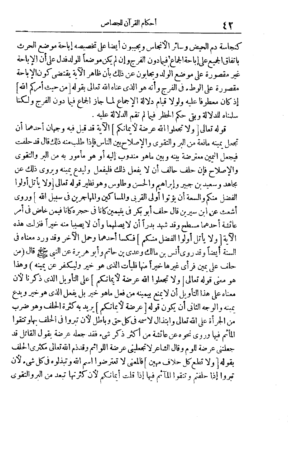 قَوْله تَعَالَى وَلا تَجْعَلُوا اللَّهَ عُرْضَةً لِأَيْمانِكُمْ الْآيَةَ قَدْ قِيلَ فِيهِ وَجْهَانِ أَحَدُهُمَا أَنْ تُجْعَلَ يَمِينُهُ مَانِعَةً مِنْ الْبِرِّ وَالتَّقْوَى وَالْإِصْلَاحِ بَيْنَ النَّاسِ فَإِذَا طُلِبَ مِنْهُ ذَلِكَ قَالَ قَدْ حَلَفْت فَيَجْعَلُ الْيَمِينَ مُعْتَرِضَةً بَيْنَهُ وَبَيْنَ مَا هُوَ مَنْدُوبٌ إلَيْهِ أَوْ هُوَ مَأْمُورٌ بِهِ مِنْ الْبِرِّ وَالتَّقْوَى وَالْإِصْلَاحِ فَإِنْ حَلَفَ حَالِفٌ أَنْ لَا يَفْعَلَ ذَلِكَ فَلْيَفْعَلْ وَلْيَدَعْ يَمِينَهُ وَيُرْوَى ذَلِكَ عَنْ مُجَاهِدٍ وَسَعِيدِ بْنِ جُبَيْرٍ وَإِبْرَاهِيمَ وَالْحَسَنِ وَطَاوُسٍ وَهُوَ نَظِيرُ قَوْله تعالى وَلا يَأْتَلِ أُولُوا الْفَضْلِ مِنْكُمْ وَالسَّعَةِ أَنْ يُؤْتُوا أُولِي الْقُرْبى وَالْمَساكِينَ وَالْمُهاجِرِينَ فِي سَبِيلِ اللَّهِ وَرَوَى أَشْعَثُ عَنْ ابْنِ سِيرِينَ قَالَ حَلَفَ أَبُو بَكْرٍ فِي يَتِيمَيْنِ كَانَا فِي حِجْرِهِ كَانَا فِيمَنْ خَاضَ فِي أَمْرِ عَائِشَةَ أَحَدُهُمَا مِسْطَحٌ وَقَدْ شَهِدَ بَدْرًا أَنْ لَا يَصِلَهُمَا وأن لا يصلهما مِنْهُ خَيْرًا فَنَزَلَتْ هَذِهِ الْآيَةُ وَلا يَأْتَلِ أُولُوا الْفَضْلِ مِنْكُمْ فَكَسَا أَحَدَهُمَا وَحَمَلَ الْآخَرَ وَقَدْ وَرَدَ مَعْنَاهُ فِي السُّنَّةِ أَيْضًا
