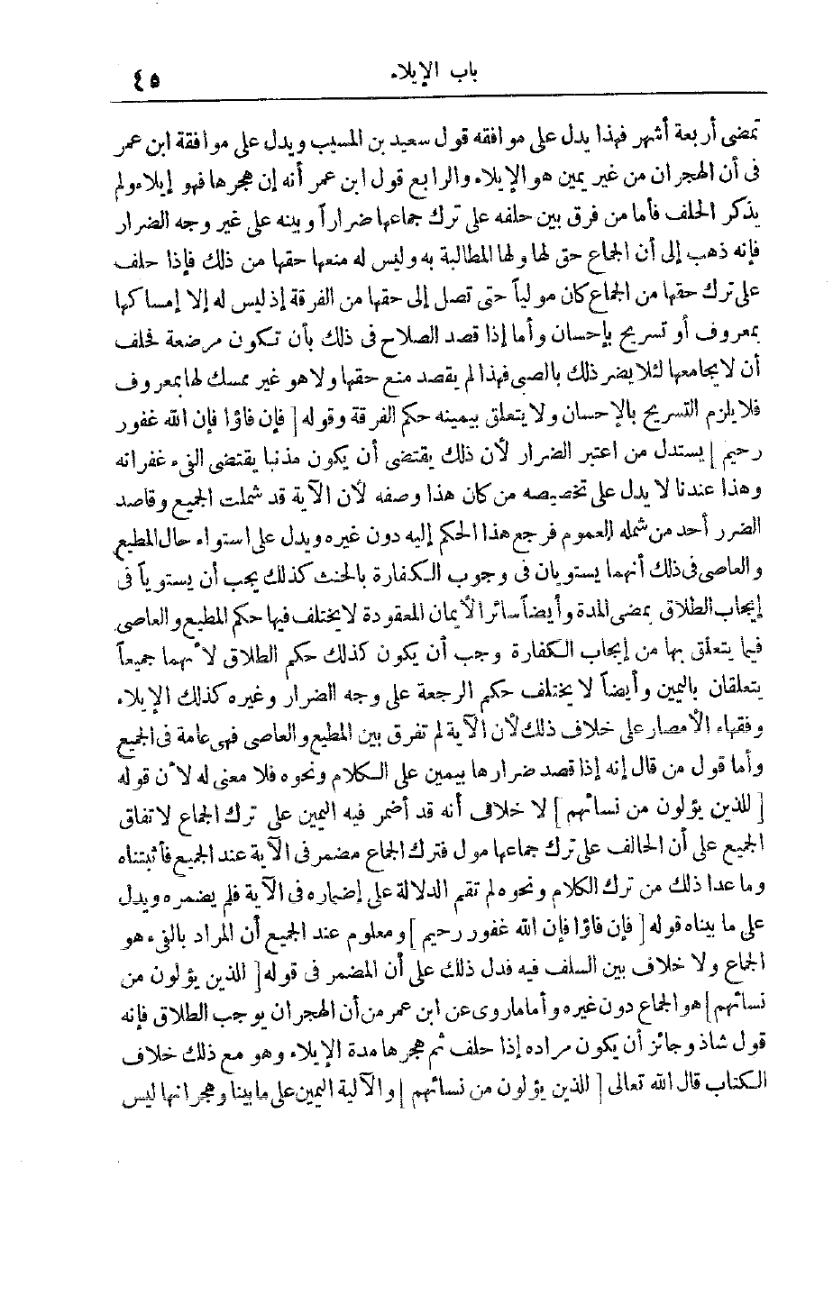 تَمْضِيَ أَرْبَعَةُ أَشْهُرٍ فَهَذَا يَدُلُّ عَلَى مُوَافَقَةِ قَوْلِ سَعِيدِ بْنِ الْمُسَيِّبِ وَيَدُلُّ عَلَى مُوَافَقَةِ ابْنِ عُمَرَ فِي أَنَّ الْهِجْرَانَ مِنْ غَيْرِ يَمِينٍ هُوَ الْإِيلَاءُ وَالرَّابِعُ قَوْلُ ابْنِ عُمَرَ أَنَّهُ إنْ هَجَرَهَا فَهُوَ إيلَاءٌ وَلَمْ يَذْكُرْ الْحَلِفَ فَأَمَّا مَنْ فَرَّقَ بَيْنَ حَلِفِهِ عَلَى تَرْكِ جِمَاعِهَا ضِرَارًا وَبَيْنَهُ عَلَى غَيْرِ وَجْهِ الضِّرَارِ فَإِنَّهُ ذَهَبَ إلَى أَنَّ الْجِمَاعَ حَقٌّ لَهَا وَلَهَا الْمُطَالَبَةُ بِهِ وَلَيْسَ لَهُ مَنْعُهَا حَقَّهَا مِنْ ذَلِكَ فَإِذَا حَلَفَ عَلَى تَرْكِ حَقِّهَا مِنْ الْجِمَاعِ كَانَ مُولِيًا حَتَّى تَصِلَ إلَى حَقِّهَا مِنْ الْفُرْقَةِ إذْ لَيْسَ لَهُ إلَّا إمْسَاكُهَا بِمَعْرُوفٍ أَوْ تَسْرِيحٌ بِإِحْسَانٍ وَأَمَّا إذَا قَصَدَ الصَّلَاحَ فِي ذَلِكَ بِأَنْ تَكُونَ مُرْضِعَةً فَحَلَفَ أَنْ لَا يُجَامِعَهَا لِئَلَّا يَضُرَّ ذَلِكَ بِالصَّبِيِّ فَهَذَا لَمْ يَقْصِدْ مَنْعَ حَقِّهَا وَلَا هُوَ غَيْرُ مُمْسِكٍ لَهَا بِمَعْرُوفٍ فَلَا يَلْزَمُ التَّسْرِيحُ بِالْإِحْسَانِ وَلَا يَتَعَلَّقُ بِيَمِينِهِ حُكْمُ الفرقة وقوله فَإِنْ فاؤُ فَإِنَّ اللَّهَ غَفُورٌ رَحِيمٌ يستدل مَنْ اعْتَبَرَ الضِّرَارَ لِأَنَّ ذَلِكَ يَقْتَضِي أَنْ يَكُونَ مُذْنِبًا يَقْتَضِي الْفَيْءَ غُفْرَانُهُ وَهَذَا عِنْدَنَا لَا يَدُلُّ عَلَى تَخْصِيصِهِ مَنْ كَانَ هَذَا وَصْفَهُ لِأَنَّ الْآيَةَ قَدْ شَمِلَتْ الْجَمِيعَ وَقَاصِدُ الضَّرَرِ أَحَدُ مَنْ شَمِلَهُ الْعُمُومُ فَرَجَعَ هَذَا الْحُكْمُ إلَيْهِ دُونَ غَيْرِهِ وَيَدُلُّ عَلَى اسْتِوَاءِ حَالِ الْمُطِيعِ وَالْعَاصِي فِي ذَلِكَ أَنَّهُمَا يَسْتَوِيَانِ فِي وُجُوبِ الْكَفَّارَةِ بِالْحِنْثِ كَذَلِكَ يَجِبُ أَنْ يَسْتَوِيَا فِي إيجَابِ الطَّلَاقِ بِمُضِيِّ الْمُدَّةِ وَأَيْضًا سائر الأيمان المعقودة لا يختلف فيها حُكْمُ الْمُطِيعِ وَالْعَاصِي فِيمَا يَتَعَلَّقُ بِهَا مِنْ إيجَابِ الْكَفَّارَةِ وَجَبَ أَنْ يَكُونَ كَذَلِكَ حُكْمُ الطَّلَاقِ لِأَنَّهُمَا جَمِيعًا يَتَعَلَّقَانِ بِالْيَمِينِ وَأَيْضًا لَا يَخْتَلِفُ حُكْمُ الرَّجْعَةِ عَلَى وَجْهِ الضِّرَارِ وَغَيْرِهِ كذلك الْإِيلَاءُ وَفُقَهَاءُ الْأَمْصَارِ عَلَى خِلَافِ ذَلِكَ لِأَنَّ الْآيَةَ لَمْ تُفَرِّقْ بَيْنَ الْمُطِيعِ وَالْعَاصِي فَهِيَ عَامَّةٌ فِي الْجَمِيعِ وَأَمَّا قَوْلُ مَنْ قَالَ إنَّهُ إذَا قَصَدَ ضِرَارَهَا بِيَمِينٍ عَلَى الْكَلَامِ وَنَحْوِهِ فَلَا مَعْنَى لَهُ لِأَنَّ قَوْلَهُ لِلَّذِينَ يُؤْلُونَ مِنْ نِسائِهِمْ لَا خِلَافَ أَنَّهُ قَدْ أَضْمَرَ فِيهِ الْيَمِينَ عَلَى تَرْكِ الْجِمَاعِ لِاتِّفَاقِ الْجَمِيعِ عَلَى أَنَّ الْحَالِفَ عَلَى تَرْكِ جِمَاعِهَا مُولٍ فَتَرْكُ الْجِمَاعِ مُضْمَرٌ فِي الْآيَةِ عِنْدَ الْجَمِيعِ فَأَثْبَتْنَاهُ وَمَا عَدَا ذَلِكَ مِنْ تَرْكِ الْكَلَامِ وَنَحْوِهِ لَمْ تَقُمْ الدَّلَالَةُ عَلَى إضْمَارِهِ فِي الْآيَةِ فَلَمْ يُضْمِرْهُ وَيَدُلُّ عَلَى مَا بَيَّنَّاهُ قَوْلُهُ فَإِنْ فاؤُ فَإِنَّ اللَّهَ غَفُورٌ رَحِيمٌ وَمَعْلُومٌ عِنْدَ الْجَمِيعِ أَنَّ الْمُرَادَ بِالْفَيْءِ هُوَ الْجِمَاعُ وَلَا خِلَافَ بَيْنَ السَّلَفِ فِيهِ فَدَلَّ ذَلِكَ عَلَى أَنَّ الْمُضْمَرَ فِي قَوْلِهِ لِلَّذِينَ يُؤْلُونَ مِنْ نِسائِهِمْ هُوَ الْجِمَاعُ دُونَ غَيْرِهِ وَأَمَّا مَا رُوِيَ عَنْ ابْنِ عُمَرَ مِنْ أَنَّ الْهِجْرَانَ يُوجِبُ الطَّلَاقَ فَإِنَّهُ قَوْلٌ شَاذٌّ وَجَائِزٌ أَنْ يَكُونَ مُرَادُهُ إذَا حَلَفَ ثُمَّ هَجَرَهَا مُدَّةَ الْإِيلَاءِ وَهُوَ مَعَ ذَلِكَ خِلَافُ الْكِتَابِ قَالَ اللَّهُ تعالى لِلَّذِينَ يُؤْلُونَ مِنْ نِسائِهِمْ وَالْأَ