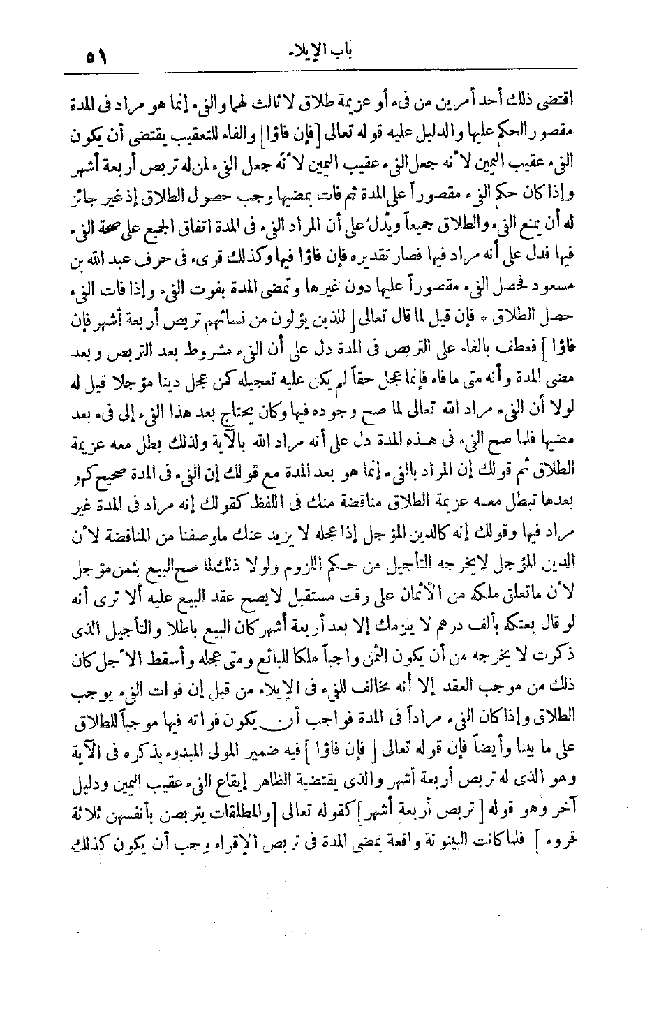 اقْتَضَى ذَلِكَ أَحَدَ أَمْرَيْنِ مِنْ فَيْءٍ أَوْ عَزِيمَةِ طَلَاقٍ لَا ثَالِثَ لَهُمَا وَالْفَيْءُ إنَّمَا هُوَ مُرَادٌ فِي الْمُدَّةِ مَقْصُورُ الْحُكْم عَلَيْهَا والدليل عليه قوله تعالى فَإِنْ فاؤُ وَالْفَاءُ لِلتَّعْقِيبِ يَقْتَضِي أَنْ يَكُونَ الْفَيْءُ عَقِيبَ الْيَمِينِ لِأَنَّهُ جَعَلَ الْفَيْءَ عَقِيبَ الْيَمِينِ لِأَنَّهُ جَعَلَ الْفَيْءَ لِمَنْ لَهُ تَرَبُّصُ أَرْبَعَةِ أَشْهُرٍ وَإِذَا كَانَ حُكْمُ الْفَيْءِ مَقْصُورًا عَلَى الْمُدَّةِ ثُمَّ فَاتَ بِمُضِيِّهَا وَجَبَ حُصُولُ الطَّلَاقِ إذْ غَيْرُ جَائِزٍ لَهُ أَنْ يَمْنَعَ الْفَيْءَ وَالطَّلَاقَ جَمِيعًا وَيَدُلُّ عَلَى أَنَّ الْمُرَادَ الْفَيْءُ فِي الْمُدَّةِ اتِّفَاقُ الْجَمِيعِ عَلَى صِحَّةِ الْفَيْءِ فِيهَا فَدَلَّ عَلَى أَنَّهُ مُرَادٌ فِيهَا فَصَارَ تَقْدِيرُهُ فإن فاؤا فِيهَا وَكَذَلِكَ قُرِئَ فِي حَرْفِ عَبْدِ اللَّهِ بْنِ مَسْعُودٍ فَحَصَلَ الْفَيْءُ مَقْصُورًا عَلَيْهَا دُونَ غَيْرِهَا وَتَمْضِي الْمُدَّةُ بِفَوْتِ
