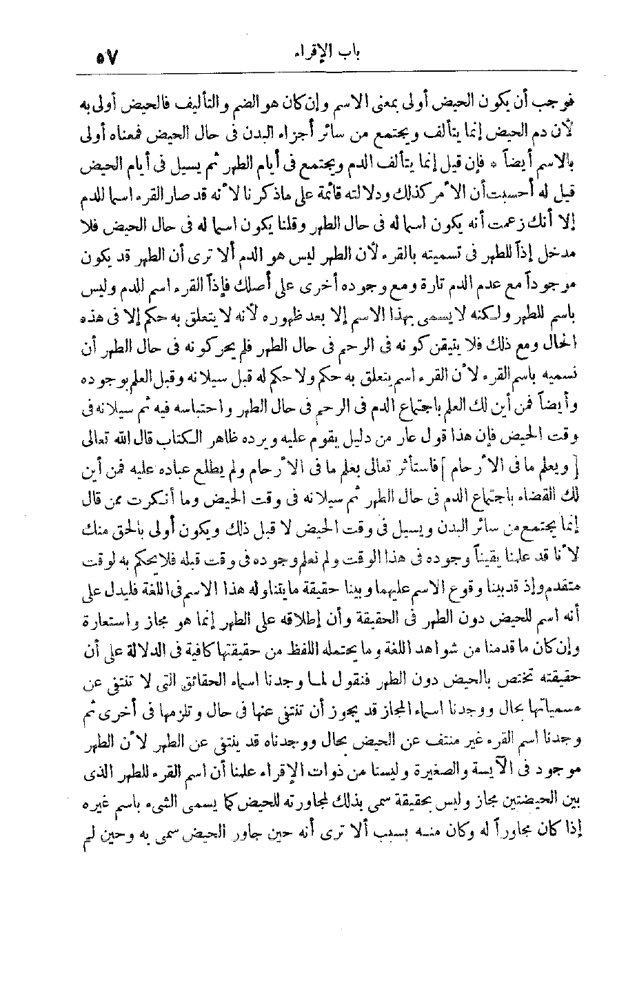 فَوَجَبَ أَنْ يَكُونَ الْحَيْضُ أَوْلَى بِمَعْنَى الِاسْمِ وَإِنْ كَانَ هُوَ الضَّمَّ وَالتَّأْلِيفَ فَالْحَيْضُ أَوْلَى بِهِ لِأَنَّ دَمَ الْحَيْضِ إنَّمَا يَتَأَلَّفُ وَيَجْتَمِعُ مِنْ سَائِرِ أَجْزَاءِ الْبَدَنِ فِي حَالِ الْحَيْضِ فَمَعْنَاهُ أَوْلَى بِالِاسْمِ أَيْضًا فَإِنْ قِيلَ إنَّمَا يَتَأَلَّفُ الدَّمُ وَيَجْتَمِعُ فِي أَيَّامِ الطُّهْرِ ثُمَّ يسيل في أيام الحيض قيل له أحسبت إنَّ الْأَمْرَ كَذَلِكَ وَدَلَالَتُهُ قَائِمَةٌ عَلَى مَا ذَكَرْنَا لِأَنَّهُ قَدْ صَارَ الْقُرْءُ اسْمًا لِلدَّمِ إلَّا أَنَّك زَعَمْت أَنَّهُ يَكُونُ اسْمًا لَهُ فِي حَالِ الطُّهْرِ وَقُلْنَا يَكُونُ اسْمًا لَهُ فِي حَالِ الْحَيْضِ فَلَا مَدْخَلَ إذًا لِلطُّهْرِ فِي تَسْمِيَتِهِ بِالْقُرْءِ لِأَنَّ الطُّهْرَ لَيْسَ هُوَ الدَّمَ أَلَا تَرَى أَنَّ الطُّهْرَ قَدْ يَكُونُ مَوْجُودًا مَعَ عَدَمِ الدَّمِ تَارَةً وَمَعَ وُجُودِهِ أُخْرَى عَلَى أَصْلِك فَإِذًا الْقُرْءُ اسْمٌ لِلدَّمِ وَلَيْسَ بِاسْمٍ لِلطُّهْرِ وَلَكِنَّهُ لَا يُسَمَّى بِهَذَا الِاسْمِ إلَّا بَعْدَ ظُهُورِهِ لِأَنَّهُ لَا يَتَعَلَّقُ بِهِ حُكْمٌ إلَّا فِي هَذِهِ الْحَالِ وَمَعَ ذَلِكَ فَلَا يُتَيَقَّنُ كَوْنُهُ فِي الرَّحِمِ فِي حال الطهر فلم يحركونه فِي حَالِ الطُّهْرِ أَنْ نُسَمِّيَهُ بِاسْمِ الْقُرْءِ لِأَنَّ الْقُرْءَ اسْمٌ يَتَعَلَّقُ بِهِ حُكْمٌ وَلَا حُكْمَ لَهُ قَبْلَ سَيَلَانِهِ وَقَبْلَ الْعِلْمِ بِوُجُودِهِ وَأَيْضًا فَمِنْ أَيْنَ لَك الْعِلْمُ بِاجْتِمَاعِ الدَّمِ في الرحم فِي حَالِ الطُّهْرِ وَاحْتِبَاسِهِ فِيهِ ثُمَّ سَيَلَانِهِ فِي وَقْتِ الْحَيْضِ فَإِنَّ هَذَا قَوْلٌ عَارٍ مِنْ دَلِيلٍ يَقُومُ عَلَيْهِ وَيَرُدُّهُ ظَاهِرُ الْكِتَابِ قَالَ اللَّهُ تَعَالَى وَيَعْلَمُ مَا فِي الْأَرْحامِ فَاسْتَأْثَرَ تَعَالَى بِعِلْمِ مَا فِي الْأَرْحَامِ وَلَمْ يُطْلِعْ عِبَادَهُ عَلَيْهِ فَمِنْ أَيْنَ لَك الْقَضَاءُ بِاجْتِمَاعِ الدَّمِ فِي حَالِ الطُّهْرِ ثُمَّ سَيَلَانِهِ فِي وَقْتِ الْحَيْضِ وَمَا أَنْكَرْت مِمَّنْ قَالَ إنَّمَا يَجْتَمِعُ مِنْ سَائِرِ الْبَدَنِ وَيَسِيلُ فِي وَقْتِ الْحَيْضِ لَا قَبْلَ ذَلِكَ وَيَكُونُ أَوْلَى بِالْحَقِّ مِنْك لِأَنَّا قَدْ عَلِمْنَا يَقِينًا وُجُودَهُ فِي هَذَا الْوَقْتِ وَلَمْ نَعْلَمْ وُجُودَهُ فِي وَقْتٍ قَبْلَهُ فَلَا يُحْكَمُ بِهِ لِوَقْتٍ مُتَقَدِّمٍ وَإِذْ قَدْ بَيَّنَّا وُقُوعَ الِاسْمِ عَلَيْهِمَا وَبَيَّنَّا حَقِيقَةَ مَا يَتَنَاوَلُهُ هَذَا الِاسْمُ فِي اللُّغَةِ فَلْيَدُلَّ عَلَى أَنَّهُ اسْمٌ لِلْحَيْضِ دُونَ الطُّهْرِ فِي الْحَقِيقَةِ وَأَنَّ إطْلَاقَهُ عَلَى الطُّهْرِ إنَّمَا هُوَ مَجَازٌ وَاسْتِعَارَةٌ وَإِنْ كَانَ مَا قَدَّمْنَا مِنْ شَوَاهِدِ اللُّغَةِ وَمَا يَحْتَمِلُهُ اللَّفْظُ مِنْ حَقِيقَتِهَا كَافِيَةً فِي الدَّلَالَةِ عَلَى أَنَّ حَقِيقَتَهُ تَخْتَصُّ بِالْحَيْضِ دُونَ الطُّهْرِ فَنَقُولُ لَمَّا وَجَدْنَا أَسْمَاءَ الْحَقَائِقِ الَّتِي لَا تَنْتَفِي عَنْ مُسَمَّيَاتِهَا بِحَالٍ وَوَجَدْنَا أَسْمَاءَ الْمَجَازَ قَدْ يَجُوزُ أَنْ تَنْتَفِيَ عَنْهَا فِي حَالٍ وَتَلْزَمَهَا فِي أُخْرَى ثُمَّ وَجَدْنَا اسْمَ الْقُرْءِ غَيْرَ مُنْتَفٍ عَنْ الْحَيْضِ بِحَالٍ وَوَجَدْنَاهُ قَدْ يَنْتَفِي عَنْ الطُّهْرِ لِأَنَّ الطُّهْرَ مَوْجُودٌ فِي الْآيِسَةِ وَالصَّغِيرَةِ وَلَيْسَتَا مِنْ ذَوَاتِ الْأَقْرَاءِ عَلِمْنَا أَنَّ اسْمَ الْقُرْءِ لِلطُّهْرِ الَّذِي بَيْنَ الْحَيْضَتَيْنِ مَجَازٌ وَلَيْسَ بِحَقِيقَةٍ سُمِّيَ بِذَلِكَ لِمُجَاوَرَتِهِ لِلْحَيْضِ كَمَا يُسَمَّى الشَّيْءُ بِاسْمِ غَيْرِهِ إذَا كَانَ مُجَاوِرًا لَهُ وَكَانَ مِنْهُ بِسَبَبٍ أَلَا تَ