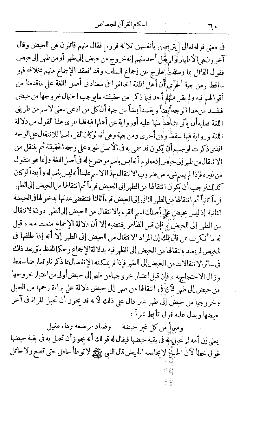 لَهُ وَأَيْضًا لَوْ كَانَ كَذَلِكَ لَوَجَبَ أَنْ يَكُونَ انْتِقَالُهَا مِنْ الطُّهْرِ إلَى الْحَيْضِ قُرْءًا ثُمَّ انْتِقَالُهَا مِنْ الْحَيْضِ إلَى الطُّهْرِ قُرْءًا ثَانِيًا ثُمَّ انْتِقَالُهَا مِنْ الطُّهْرِ الثَّانِي إلَى الْحَيْضِ قُرْءًا ثَالِثًا فَتَنْقَضِي عِدَّتُهَا بِدُخُولِهَا فِي الْحَيْضَةِ الثَّانِيَةِ إذْ لَيْسَ بِحَيْضٍ عَلَى أَصْلِك اسْمُ الْقُرْءِ بِالِانْتِقَالِ مِنْ الْحَيْضِ إلَى الطُّهْرِ دُونَ الِانْتِقَالِ مِنْ الطُّهْرِ إلَى الْحَيْضِ فَإِنْ قِيلَ الظَّاهِرُ يَقْتَضِيهِ إلَّا أَنَّ دَلَالَةَ الْإِجْمَاعِ مَنَعَتْ مِنْهُ قِيلَ لَهُ مَا أَنْكَرْت مِمَّنْ قَالَ لَك إنَّ الْمُرَادَ الِانْتِقَالُ مِنْ الْحَيْضِ إلَى الطُّهْرِ إلَّا أَنَّهُ إذَا طَلَّقَهَا فِي الْحَيْضِ لَمْ يُعْتَدَّ بِانْتِقَالِهَا من الحيض إلى الظهر فِيهِ بِدَلَالَةِ الْإِجْمَاعِ وَحُكْمُ اللَّفْظِ بَاقٍ بَعْدَ ذَلِكَ فِي سَائِرِ الِانْتِقَالَاتِ مِنْ الْحَيْضِ إلَى الطُّهْرِ فَإِذَا لَمْ يُمْكِنْهُ الِانْفِصَالُ مِمَّا ذَكَرْنَا وَتَعَارَضَا سَقَطَا وَزَالَ الِاحْتِجَاجُ بِهِ فَإِنْ قِيلَ اعْتِبَارُ خُرُوجِهَا مِنْ طُهْرٍ إلَى حَيْضٍ أَوْلَى مِنْ اعْتِبَارِ خُرُوجِهَا مِنْ حَيْضٍ إلَى طُهْرٍ لِأَنَّ فِي انْتِقَالِهَا مِنْ طُهْرٍ إلَى حَيْضٍ دَلَالَةً عَلَى بَرَاءَةِ رَحِمِهَا مِنْ الْحَبَلِ وَخُرُوجُهَا مِنْ حَيْضٍ إلَى طُهْرٍ غَيْرُ دَالٍّ عَلَى ذَلِكَ لِأَنَّهُ قَدْ يَجُوزُ أَنْ تَحْبَلَ الْمَرْأَةُ فِي آخِرِ حَيْضِهَا وَيَدُلُّ عَلَيْهِ قَوْلُ تَأَبَّطَ شَرًّا: