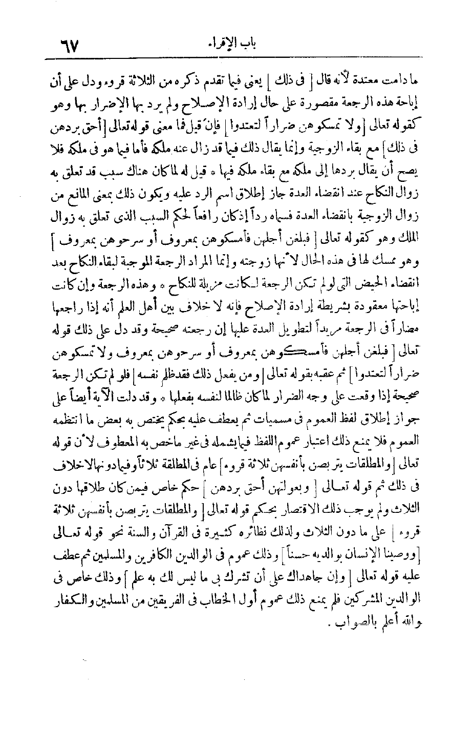 مَا دَامَتْ مُعْتَدَّةً لِأَنَّهُ قَالَ فِي ذلِكَ يَعْنِي فِيمَا تَقَدَّمَ ذِكْرُهُ مِنْ الثَّلَاثَةِ قُرُوءٍ وَدَلَّ عَلَى أَنَّ إبَاحَةَ هَذِهِ الرَّجْعَةِ مَقْصُورَةٌ عَلَى حَالِ إرَادَةِ الْإِصْلَاحِ وَلَمْ يُرِدْ بِهَا الْإِضْرَارَ بِهَا وَهُوَ كَقَوْلِهِ تَعَالَى وَلا تُمْسِكُوهُنَّ ضِراراً لِتَعْتَدُوا فَإِنْ قِيلَ فَمَا مَعْنَى قَوْله تَعَالَى أَحَقُّ بِرَدِّهِنَّ فِي ذلِكَ مَعَ بَقَاءِ الزَّوْجِيَّةِ وَإِنَّمَا يُقَالُ ذَلِكَ فِيمَا قَدْ زَالَ عَنْهُ مِلْكُهُ فَأَمَّا فِيمَا هُوَ فِي مِلْكِهِ فَلَا يَصِحُّ أَنْ يُقَالَ بِرَدِّهَا إلَى مِلْكِهِ مَعَ بَقَاءِ مِلْكِهِ فِيهَا قِيلَ لَهُ لَمَّا كَانَ هُنَاكَ سَبَبٌ قَدْ تَعَلَّقَ بِهِ زَوَالُ النِّكَاحِ عِنْدَ انْقِضَاءِ الْعِدَّةِ جَازَ إطْلَاقُ اسْمِ الرَّدِّ عَلَيْهِ وَيَكُونُ ذَلِكَ بِمَعْنَى الْمَانِعِ مِنْ زَوَالِ الزَّوْجِيَّةِ بِانْقِضَاءِ الْعِدَّةِ فَسَمَّاهُ رَدًّا إذْ كَانَ رَافِعًا لِحُكْمِ السَّبَبِ الَّذِي تَعَلَّقَ بِهِ زَوَالُ الْمِلْكِ وَهُوَ كَقَوْلِهِ تَعَالَى فَبَلَغْنَ أَجَلَهُنَّ فَأَمْسِكُوهُنَّ بِمَعْرُوفٍ أَوْ سَرِّحُوهُنَّ بِمَعْرُوفٍ وَهُوَ مُمْسِكٌ لَهَا فِي هَذِهِ الْحَالِ لِأَنَّهَا زَوْجَتُهُ وَإِنَّمَا الْمُرَادُ الرَّجْعَةُ الْمُوجِبَةُ لِبَقَاءِ النِّكَاحِ بَعْدَ انْقِضَاءِ الْحَيْضِ الَّتِي لَوْ لَمْ تَكُنْ الرَّجْعَةُ لَكَانَتْ مُزِيلَةً لِلنِّكَاحِ وَهَذِهِ الرَّجْعَةُ وَإِنْ كَانَتْ إبَاحَتُهَا مَعْقُودَةً بِشَرِيطَةِ إرَادَةِ الْإِصْلَاحِ فَإِنَّهُ لَا خِلَافَ بَيْنَ أَهْلِ الْعِلْمِ أَنَّهُ إذَا رَاجَعَهَا مُضَارًّا فِي الرَّجْعَةِ مُرِيدًا لِتَطْوِيلِ الْعِدَّةِ عَلَيْهَا أَنَّ رَجْعَتَهُ صَحِيحَةٌ وَقَدْ دَلَّ عَلَى ذَلِكَ قَوْله تَعَالَى فَبَلَغْنَ أَجَلَهُنَّ فَأَمْسِكُوهُنَّ بِمَعْرُوفٍ أَوْ سَرِّحُوهُنَّ بِمَعْرُوفٍ وَلا تُمْسِكُوهُنَّ ضِراراً لِتَعْتَدُوا ثُمَّ عَقَّبَهُ بِقَوْلِهِ تَعَالَى وَمَنْ يَفْعَلْ ذلِكَ فَقَدْ ظَلَمَ نَفْسَهُ فَلَوْ لَمْ تَكُنْ الرَّجْعَةُ صَحِيحَةً إذَا وَقَعَتْ عَلَى وَجْهِ الضِّرَارِ لَمَا كَانَ ظَالِمًا لِنَفْسِهِ بِفِعْلِهَا وَقَدْ دَلَّتْ الْآيَةُ أَيْضًا عَلَى جَوَازِ إطْلَاقِ لَفْظِ الْعُمُومِ فِي مُسَمَّيَاتٍ ثُمَّ يُعْطَفُ عَلَيْهِ بِحُكْمٍ يَخْتَصُّ بِهِ بَعْضُ مَا انْتَظَمَهُ الْعُمُومُ فَلَا يَمْنَعُ ذَلِكَ اعْتِبَارَ عُمُومِ اللَّفْظِ فِيمَا يَشْمَلُهُ فِي غَيْرِ مَا خُصَّ بِهِ الْمَعْطُوفُ لِأَنَّ قَوْله تَعَالَى وَالْمُطَلَّقاتُ يَتَرَبَّصْنَ بِأَنْفُسِهِنَّ ثَلاثَةَ قُرُوءٍ عَامٌّ فِي الْمُطَلَّقَةِ ثَلَاثًا وَفِيمَا دُونَهَا لَا خِلَافَ فِي ذَلِكَ ثُمَّ قَوْله تَعَالَى وَبُعُولَتُهُنَّ أَحَقُّ بِرَدِّهِنَّ حُكْمٌ خَاصٌّ فِيمَنْ كَانَ طَلَاقُهَا دُونَ الثَّلَاثِ وَلَمْ يُوجِبْ ذَلِكَ الِاقْتِصَارَ بِحُكْمِ قَوْله تَعَالَى وَالْمُطَلَّقاتُ يَتَرَبَّصْنَ بِأَنْفُسِهِنَّ ثَلاثَةَ قُرُوءٍ على ما دون الثلاث ولذلك نظائره كَثِيرَةٌ فِي الْقُرْآنِ وَالسُّنَّةِ نَحْوُ قَوْله تَعَالَى وَوَصَّيْنَا الْإِنْسانَ بِوالِدَيْهِ حُسْناً وَذَلِكَ عُمُومٌ فِي الْوَالِدَيْنِ الْكَافِرَيْنِ وَالْمُسْلِمَيْنِ ثُمَّ عَطَفَ عَلَيْهِ قَوْله تَعَالَى وَإِنْ جاهَداكَ عَلى أَنْ تُشْرِكَ بِي مَا لَيْسَ لَكَ بِهِ عِلْمٌ