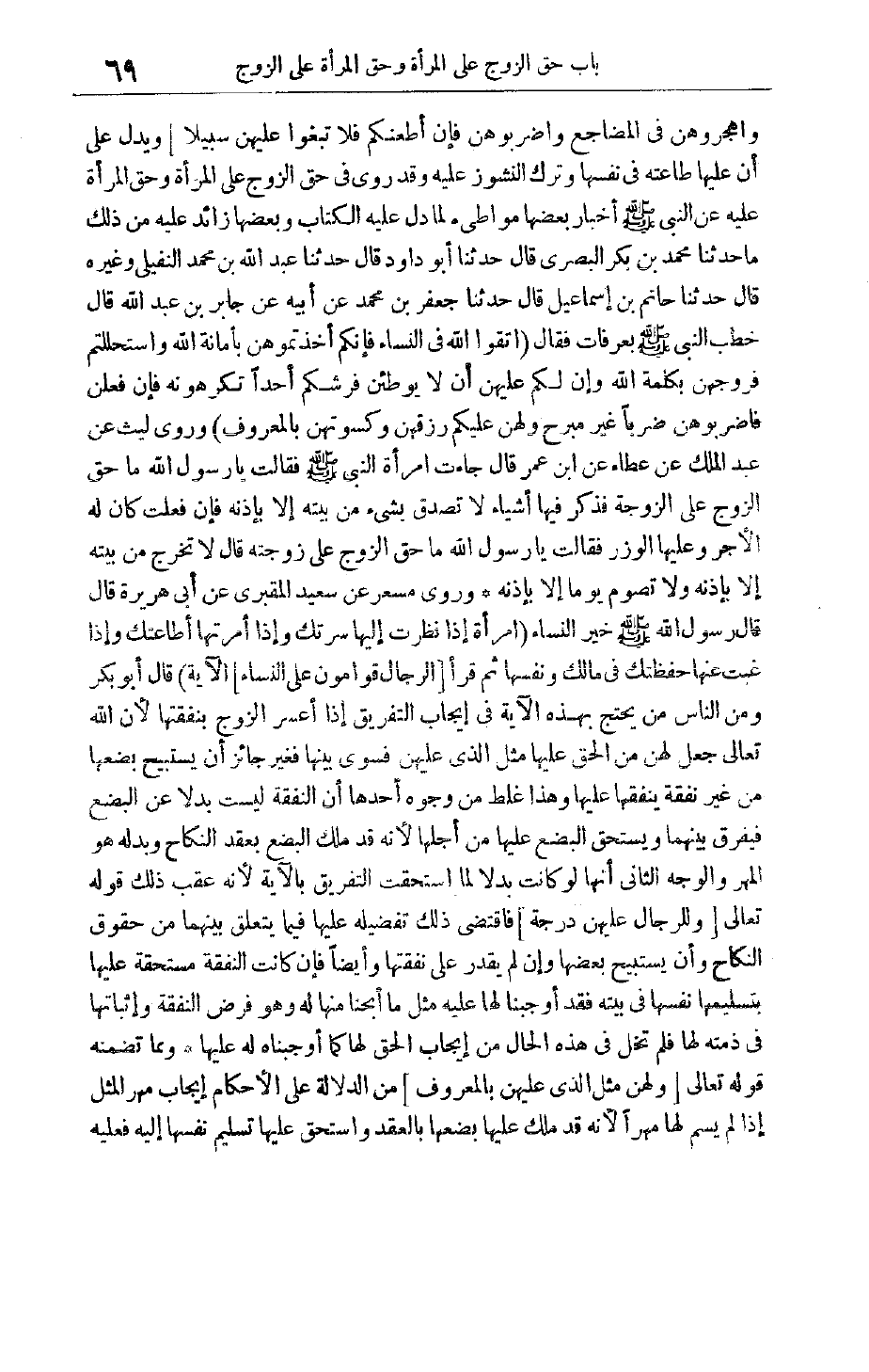 مَا حَدَّثَنَا مُحَمَّدُ بْنُ بَكْرٍ الْبَصْرِيُّ قَالَ حَدَّثَنَا أَبُو دَاوُد قَالَ حَدَّثَنَا عَبْدُ اللَّهِ بْنُ مُحَمَّدٍ النُّفَيْلِيِّ وَغَيْرُهُ قَالَ حَدَّثَنَا حَاتِمُ بْنُ إسْمَاعِيلَ قَالَ حَدَّثَنَا جَعْفَرُ بْنُ مُحَمَّدٍ عَنْ أَبِيهِ عَنْ جَابِرِ بْنِ عَبْدِ اللَّهِ قَالَ خَطَبَ النَّبِيُّ صَلَّى اللَّهُ عَلَيْهِ وَسَلَّمَ بِعَرَفَاتٍ فَقَالَ (اتَّقُوا اللَّهَ فِي النِّسَاءِ فَإِنَّكُمْ أَخَذْتُمُوهُنَّ بِأَمَانَةِ اللَّهِ وَاسْتَحْلَلْتُمْ فُرُوجَهُنَّ بِكَلِمَةِ اللَّهِ وَإِنَّ لَكُمْ عَلَيْهِنَّ أَنْ لَا يُوطِئْنَ فُرُشَكُمْ أَحَدًا تَكْرَهُونَهُ فَإِنْ فَعَلْنَ فَاضْرِبُوهُنَّ ضَرْبًا غَيْرَ مُبَرِّحٍ وَلَهُنَّ عَلَيْكُمْ رِزْقُهُنَّ وَكِسْوَتُهُنَّ بِالْمَعْرُوفِ)