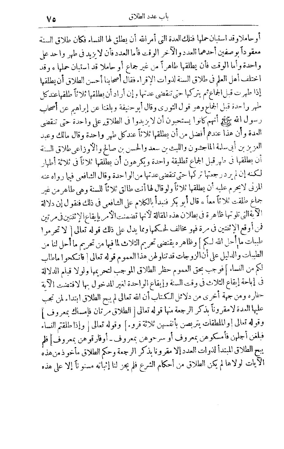 النِّسَاءُ فَكَانَ طَلَاقُ السُّنَّةِ مَعْقُودًا بِوَصْفَيْنِ أَحَدُهُمَا الْعَدَدُ وَالْآخَرُ الْوَقْتُ فَأَمَّا الْعَدَدُ فَأَنْ لَا يَزِيدَ فِي طُهْرٍ وَاحِدٍ عَلَى وَاحِدَةٍ وَأَمَّا الْوَقْتُ فَأَنْ يُطَلِّقَهَا طَاهِرًا مِنْ غَيْرِ جِمَاعٍ أَوْ حَامِلًا قَدْ اسْتَبَانَ حَمْلُهَا وَقَدْ اخْتَلَفَ أَهْلُ الْعِلْمِ فِي طَلَاقِ السُّنَّةِ لِذَوَاتِ الْأَقْرَاءِ فَقَالَ أَصْحَابُنَا أَحْسَنُ الطَّلَاقِ أَنْ يُطَلِّقَهَا إذَا طَهُرَتْ قَبْلَ الْجِمَاعِ ثُمَّ يَتْرُكَهَا حَتَّى تَنْقَضِيَ عِدَّتُهَا وَإِنْ أَرَادَ أَنْ يُطَلِّقَهَا ثَلَاثًا طَلَّقَهَا عِنْدَ كُلِّ طُهْرٍ وَاحِدَةً قَبْلَ الْجِمَاعِ وَهُوَ قَوْلُ الثَّوْرِيِّ وَقَالَ أَبُو حَنِيفَةَ وَبَلَغَنَا عَنْ إبْرَاهِيمَ عَنْ أَصْحَابِ رَسُولِ اللَّهِ صَلَّى اللَّهُ عَلَيْهِ وَسَلَّمَ أَنَّهُمْ كَانُوا يَسْتَحِبُّونَ أَنْ لَا يَزِيدُوا فِي الطَّلَاقِ عَلَى وَاحِدَةِ حَتَّى تَنْقَضِيَ الْعِدَّةُ وَأَنَّ هَذَا عِنْدَهُمْ أَفْضَلُ مِنْ أَنْ يُطَلِّقَهَا ثَلَاثًا عِنْدَ كُلِّ طُهْرٍ وَاحِدَةً وَقَالَ مَالِكٌ وَعَبْدُ الْعَزِيزِ بْنُ أَبِي سَلَمَةَ الْمَاجِشُونُ وَاللَّيْثُ بْنُ سَعْدٍ وَالْحَسَنُ بْنُ صَالِحٍ وَالْأَوْزَاعِيُّ طَلَاقُ السُّنَّةِ أَنْ يُطَلِّقَهَا فِي طُهْرٍ قَبْلَ الْجِمَاعِ تَطْلِيقَةً وَاحِدَةً وَيَكْرَهُونَ أَنْ يُطَلِّقَهَا ثَلَاثًا فِي ثَلَاثَةِ أَطْهَارٍ لَكِنَّهُ إنْ لَمْ يُرِدْ رَجْعَتَهَا تَرَكَهَا حَتَّى تَنْقَضِيَ عِدَّتُهَا مِنْ الْوَاحِدَةِ وَقَالَ الشَّافِعِيُّ فِيمَا رَوَاهُ عَنْهُ الْمُزَنِيّ لَا يَحْرُمُ عَلَيْهِ أَنْ يُطَلِّقَهَا ثَلَاثًا وَلَوْ قَالَ لَهَا أَنْتِ طَالِقٌ ثَلَاثًا لِلسُّنَّةِ وَهِيَ طَاهِرٌ مِنْ غَيْرِ جِمَاعٍ طَلُقَتْ ثَلَاثًا مَعًا قَالَ أَبُو بَكْرٍ فَنَبْدَأُ بِالْكَلَامِ عَلَى الشَّافِعِيِّ فِي ذَلِكَ فنقول إن دلالة الآية التي تلوتها ظَاهِرَةٌ فِي بُطْلَانِ هَذِهِ الْمَقَالَةِ لِأَنَّهَا تَضَمَّنَتْ الْأَمْرَ بِإِيقَاعِ الِاثْنَتَيْنِ فِي مَرَّتَيْنِ فَمَنْ أَوْقَعَ الِاثْنَتَيْنِ فِي مَرَّةٍ فَهُوَ مُخَالِفٌ لِحُكْمِهَا وَمِمَّا يَدُلُّ عَلَى ذَلِكَ قَوْله تَعَالَى لا تُحَرِّمُوا طَيِّباتِ مَا أَحَلَّ اللَّهُ لَكُمْ وَظَاهِرُهُ يَقْتَضِي تَحْرِيمَ الثَّلَاثِ لِمَا فِيهَا مِنْ تَحْرِيمِ مَا أَحَلَّ لَنَا مِنْ الطَّيِّبَاتِ وَالدَّلِيلُ عَلَى أَنَّ الزَّوْجَاتِ قَدْ تَنَاوَلَهُنَّ هَذَا الْعُمُومُ قَوْله تَعَالَى فَانْكِحُوا مَا طابَ لَكُمْ مِنَ النِّساءِ فَوَجَبَ بِحَقِّ الْعُمُومِ حَظْرُ الطَّلَاقِ الْمُوجِبِ لِتَحْرِيمِهَا وَلَوْلَا قِيَامُ الدَّلَالَةِ فِي إبَاحَةِ إيقَاعِ الثَّلَاثِ فِي وَقْتِ السُّنَّةِ وَإِيقَاعِ الْوَاحِدَةِ لِغَيْرِ المدخول بها لَاقْتَضَتْ الْآيَةُ حَظْرَهُ وَمِنْ جِهَةٍ أُخْرَى مِنْ دَلَائِلِ الْكِتَابِ أَنَّ اللَّهَ تَعَالَى لَمْ يُبِحْ الطلاق ابتداء لمن تجب عليها العدة لا مَقْرُونًا بِذِكْرِ الرَّجْعَةِ مِنْهَا قَوْله تَعَالَى الطَّلاقُ مَرَّتانِ فَإِمْساكٌ بِمَعْرُوفٍ وقَوْله تَعَالَى وَالْمُطَلَّقاتُ يَتَرَبَّصْنَ بِأَنْفُسِهِنَّ ثَلاثَةَ قُرُوءٍ وقَوْله تَعَالَى وَإِذا طَلَّقْتُمُ النِّساءَ فَبَلَغْنَ أَجَلَهُنَّ فَأَمْسِكُوهُنَّ بِمَعْرُوفٍ أَوْ سَرِّحُوهُنَّ بِمَعْرُوفٍ- أَوْ فارِقُوهُنَّ بِمَعْرُوفٍ فَلَمْ يُبِحْ الطَّلَاقَ الْمُبْتَدَأَ لِذَوَاتِ الْعَدَدِ إلَّا مَقْرُونًا بِذِكْرِ الرَّجْعَةِ وَحُكْمُ الطَّلَاقِ مَأْخُوذٌ مِنْ هَذِهِ الْآيَاتِ لَوْلَاهَا لَمْ يَكُنْ الطَّلَاقُ مِنْ أَحْكَامِ الشَّرْعِ فَلَمْ يَجُزْ لَنَا إثْبَاتُهُ مَسْنُونًا إلَّا عَلَى هَذِهِ