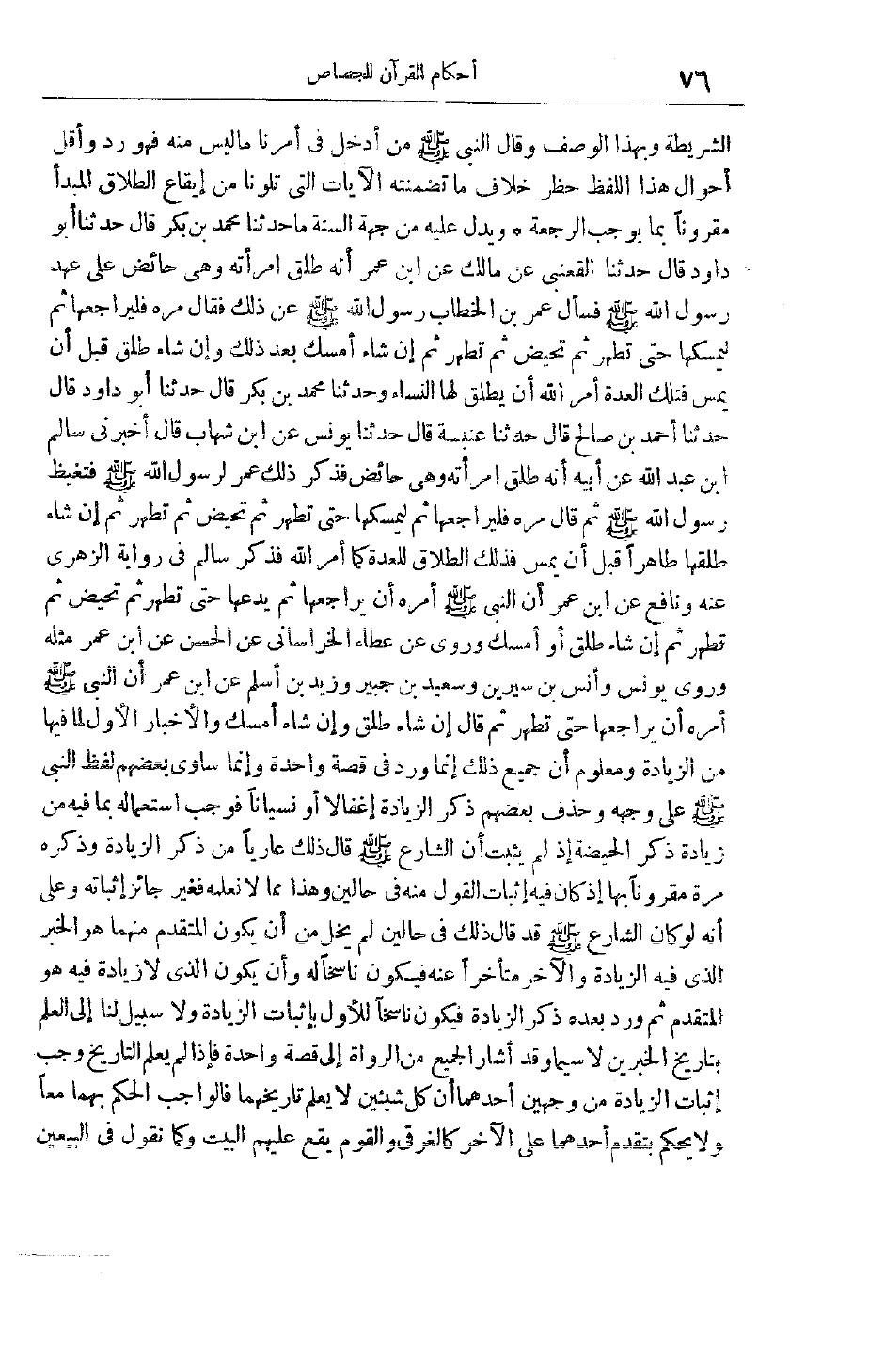 والأخبار الأول لِمَا فِيهَا مِنْ الزِّيَادَةِ وَمَعْلُومٌ أَنَّ جَمِيعَ ذَلِكَ إنَّمَا وَرَدَ فِي قِصَّةٍ وَاحِدَةٍ وَإِنَّمَا ساوى بَعْضُهُمْ لَفْظَ النَّبِيِّ صَلَّى اللَّهُ عَلَيْهِ وَسَلَّمَ عَلَى وَجْهِهِ وَحَذَفَ بَعْضُهُمْ ذِكْرَ الزِّيَادَةِ إغْفَالًا أَوْ نِسْيَانًا فَوَجَبَ اسْتِعْمَالُهُ بِمَا فِيهِ مِنْ زِيَادَةِ ذِكْرِ الْحَيْضَةِ إذْ لَمْ يَثْبُتْ أَنَّ الشَّارِعَ صَلَّى اللَّهُ عَلَيْهِ وَسَلَّمَ قَالَ ذَلِكَ عَارِيًّا مِنْ ذِكْرِ الزِّيَادَةِ وَذَكَرَهُ مَرَّةً مَقْرُونًا بِهَا إذْ كَانَ فِيهِ إثْبَاتُ الْقَوْلِ مِنْهُ فِي حَالَيْنِ وَهَذَا مِمَّا لَا نَعْلَمُهُ فَغَيْرُ جَائِزٍ إثْبَاتُهُ وَعَلَى أَنَّهُ لَوْ كَانَ الشَّارِعُ صَلَّى اللَّهُ عَلَيْهِ وَسَلَّمَ قَدْ قَالَ ذَلِكَ فِي حَالَيْنِ لَمْ يَخْلُ مِنْ أَنْ يَكُونَ الْمُتَقَدِّمُ مِنْهُمَا هُوَ الْخَبَرُ الَّذِي فِيهِ الزِّيَادَةُ وَالْآخَرُ مُتَأَخِّرًا عَنْهُ فَيَكُونُ نَاسِخًا لَهُ وَأَنْ يَكُونَ الَّذِي لَا زِيَادَةَ فِيهِ هُوَ الْمُتَقَدِّمُ ثُمَّ وَرَدَ بَعْدَهُ ذِكْرُ الزِّيَادَةِ فَيَكُونُ نَاسِخًا لِلْأَوَّلِ بِإِثْبَاتِ الزِّيَادَةِ وَلَا سَبِيلَ لَنَا إلَى الْعِلْمِ بِتَارِيخِ الْخَبَرَيْنِ لَا سِيَّمَا وَقَدْ أَشَارَ الْجَمِيعُ مِنْ الرُّوَاةِ إلَى قِصَّةٍ وَاحِدَةٍ فَإِذَا لَمْ يُعْلَمْ التَّارِيخُ وَجَبَ إثْبَاتُ الزِّيَادَةِ مِنْ وَجْهَيْنِ أَحَدُهُمَا أَنَّ كُلَّ شَيْئَيْنِ لَا يُعْلَمُ تَارِيخُهُمَا فَالْوَاجِبُ الْحُكْمُ بِهِمَا مَعًا وَلَا يُحْكَمُ بِتَقَدُّمِ أَحَدِهِمَا عَلَى الْآخَرِ كَالْغَرْقَى وَالْقَوْمُ يَقَعُ عَلَيْهِمْ الْبَيْتُ وَكَمَا نَقُولُ فِي الْبَيْعَيْنِ