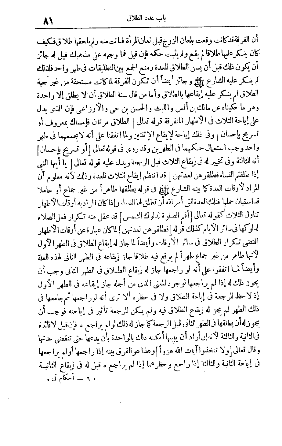 أَنَّ الْفُرْقَةَ قَدْ كَانَتْ وَقَعَتْ بِلِعَانِ الزَّوْجِ قَبْلَ لِعَانِ الْمَرْأَةِ فَبَانَتْ مِنْهُ وَلَمْ يَلْحَقْهَا طَلَاقٌ فَكَيْفَ كَانَ يُنْكِرُ عَلَيْهَا طَلَاقًا لَمْ يَقَعْ وَلَمْ يَثْبُتْ حُكْمُهُ فَإِنْ قِيلَ فَمَا وَجْهُهُ عَلَى مَذْهَبِك قِيلَ لَهُ جَائِزٌ أَنْ يَكُونَ ذَلِكَ قَبْلَ أَنْ يُسَنَّ الطَّلَاقُ لِلْعِدَّةِ وَمَنْعِ الْجَمْعِ بَيْنَ التَّطْلِيقَاتِ فِي طُهْرٍ وَاحِدٍ فَلِذَلِكَ لَمْ يُنْكِرْ عَلَيْهِ الشَّارِعُ صَلَّى اللَّهُ عَلَيْهِ وَسَلَّمَ وَجَائِزٌ أَيْضًا أَنْ تَكُونَ الْفُرْقَةُ لَمَّا كَانَتْ مُسْتَحَقَّةً مِنْ غَيْرِ جِهَةِ الطَّلَاقِ لَمْ يُنْكِرْ عَلَيْهِ إيقَاعَهَا بِالطَّلَاقِ وَأَمَّا مَنْ قَالَ سُنَّةُ الطَّلَاقِ أَنْ لَا يُطَلِّقَ إلَّا وَاحِدَةً وَهُوَ مَا حَكَيْنَاهُ عَنْ مَالِكِ بْنِ أَنَسٍ وَاللَّيْثِ وَالْحَسَنِ بْنِ حَيٍّ وَالْأَوْزَاعِيُّ فَإِنَّ الَّذِي يَدُلُّ عَلَى إبَاحَةِ الثَّلَاثِ فِي الْأَطْهَارِ الْمُتَفَرِّقَةِ قَوْله تَعَالَى الطَّلاقُ مَرَّتانِ فَإِمْساكٌ بِمَعْرُوفٍ أَوْ تَسْرِيحٌ بِإِحْسانٍ وَفِي ذَلِكَ إبَاحَةٌ لِإِيقَاعِ الِاثْنَتَيْنِ وَلَمَّا اتَّفَقْنَا عَلَى أَنَّهُ لَا يَجْمَعُهُمَا فِي طُهْرٍ وَاحِدٍ وَجَبَ اسْتِعْمَالُ حُكْمِهِمَا فِي الطُّهْرَيْنِ وَقَدْ رُوِيَ في قوله تعالى أَوْ تَسْرِيحٌ بِإِحْسانٍ أنه للثالثة وفي تَخْيِيرٌ لَهُ فِي إيقَاعِ الثَّلَاثِ قَبْلَ الرَّجْعَةِ وَيَدُلُّ عَلَيْهِ قَوْله تَعَالَى يَا أَيُّهَا النَّبِيُّ إِذا طَلَّقْتُمُ النِّساءَ فَطَلِّقُوهُنَّ لِعِدَّتِهِنَّ قَدْ انْتَظَمَ إيقَاعَ الثَّلَاثِ لِلْعِدَّةِ وَذَلِكَ لِأَنَّهُ مَعْلُومٌ أَنَّ الْمُرَادَ لِأَوْقَاتِ الْعِدَّةِ كَمَا بَيَّنَهُ الشَّارِعُ صَلَّى اللَّهُ عَلَيْهِ وَسَلَّمَ فِي