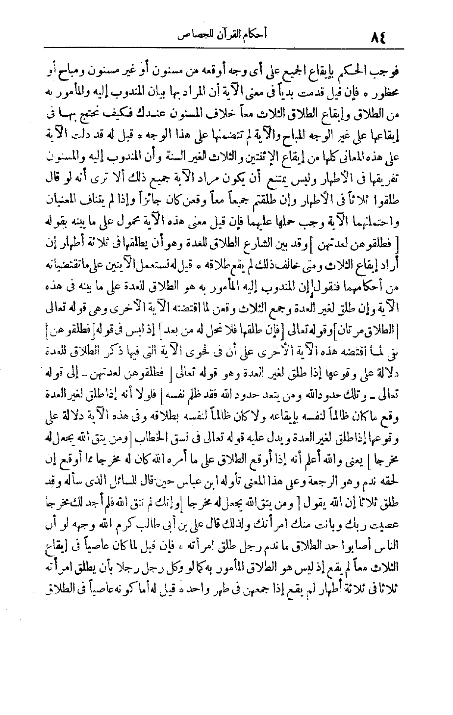 فَوَجَبَ الْحُكْمُ بِإِيقَاعِ الْجَمِيعِ عَلَى أَيِّ وَجْهٍ أَوْقَعَهُ مِنْ مَسْنُونٍ أَوْ غَيْرِ مَسْنُونٍ وَمُبَاحٍ أَوْ مَحْظُورٍ فَإِنْ قِيلَ قَدَّمْت بَدِيًّا فِي مَعْنَى الْآيَةِ أَنَّ الْمُرَادَ بِهَا بَيَانُ الْمَنْدُوبِ إلَيْهِ وَالْمَأْمُورِ بِهِ مِنْ الطَّلَاقِ وَإِيقَاعُ الطَّلَاقِ الثلاث معا خلاف المسنون عندك فكيف نحتج بِهَا فِي إيقَاعِهَا عَلَى غَيْرِ الْوَجْهِ الْمُبَاحِ وَالْآيَةُ لَمْ تَتَضَمَّنْهَا عَلَى هَذَا الْوَجْهِ قِيلَ لَهُ قَدْ دَلَّتْ الْآيَةُ عَلَى هَذِهِ الْمَعَانِي كلها من إيقاع الاثنتين والثلاث الغير السُّنَّةِ وَأَنَّ الْمَنْدُوبَ إلَيْهِ وَالْمَسْنُونَ تَفْرِيقُهَا فِي الْأَطْهَارِ وَلَيْسَ يَمْتَنِعُ أَنْ يَكُونَ مُرَادُ الْآيَةِ جَمِيعَ ذَلِكَ أَلَا تَرَى أَنَّهُ لَوْ قَالَ طَلِّقُوا ثَلَاثًا فِي الْأَطْهَارِ وَإِنْ طَلَّقْتُمْ جَمِيعًا معا وقعن كان جائزا وإذا لم يتناف المعنيان واحتملتها الْآيَةُ وَجَبَ حَمْلُهَا عَلَيْهِمَا فَإِنْ قِيلَ مَعْنَى هَذِهِ الْآيَةِ مَحْمُولٌ عَلَى مَا بَيَّنَهُ بِقَوْلِهِ فَطَلِّقُوهُنَّ لِعِدَّتِهِنَّ وَقَدْ بَيَّنَ الشَّارِعُ الطَّلَاقَ لِلْعِدَّةِ وَهُوَ أَنْ يُطَلِّقَهَا فِي ثَلَاثَةِ أَطْهَارٍ إنْ أَرَادَ إيقَاعَ الثَّلَاثِ وَمَتَى خَالَفَ ذَلِكَ لَمْ يَقَعْ طَلَاقُهُ قِيلَ لَهُ نَسْتَعْمِلُ الْآيَتَيْنِ عَلَى مَا تَقْتَضِيَانِهِ مِنْ أَحْكَامِهِمَا فَنَقُولُ إنَّ الْمَنْدُوبَ إلَيْهِ الْمَأْمُورُ بِهِ هُوَ الطَّلَاقُ لِلْعِدَّةِ عَلَى مَا بَيَّنَهُ فِي هَذِهِ الْآيَةِ وَإِنْ طَلَّقَ لِغَيْرِ الْعِدَّةِ وَجَمَعَ الثَّلَاثَ وَقَعْنَ لِمَا اقْتَضَتْهُ الْآيَةُ الْأُخْرَى وهي قوله تعالى الطَّلاقُ مَرَّتانِ وقَوْله تَعَالَى فَإِنْ طَلَّقَها فَلا تَحِلُّ لَهُ مِنْ بَعْدُ إذْ لَيْسَ فِي قَوْلِهِ فَطَلِّقُوهُنَّ نَفْيٌ لِمَا اقتضه هَذِهِ الْآيَةُ الْأُخْرَى عَلَى أَنَّ فِي فَحْوَى الْآيَةِ الَّتِي فِيهَا ذِكْرُ الطَّلَاقِ لِلْعِدَّةِ دَلَالَةٌ عَلَى وُقُوعِهَا إذَا طَلَّقَ لِغَيْرِ الْعِدَّةِ وَهُوَ قوله تعالى فَطَلِّقُوهُنَّ لِعِدَّتِهِنَّ- إلَى قَوْله تَعَالَى- وَتِلْكَ حُدُودُ اللَّهِ وَمَنْ يَتَعَدَّ حُدُودَ اللَّهِ فَقَدْ ظَلَمَ نَفْسَهُ فَلَوْلَا أَنَّهُ إذَا طَلَّقَ لِغَيْرِ الْعِدَّةِ وَقَعَ مَا كَانَ ظَالِمًا لِنَفْسِهِ بِإِيقَاعِهِ وَلَا كَانَ ظَالِمًا لِنَفْسِهِ بِطَلَاقِهِ وَفِي هَذِهِ الْآيَةِ دَلَالَةٌ عَلَى وُقُوعِهَا إذَا طَلَّقَ لِغَيْرِ الْعِدَّةِ وَيَدُلُّ عَلَيْهِ قَوْله تَعَالَى فِي نَسَقِ الْخِطَابِ وَمَنْ يَتَّقِ اللَّهَ يَجْعَلْ لَهُ مَخْرَجاً يَعْنِي وَاَللَّهُ أَعْلَمُ أَنَّهُ إذَا أَوْقَعَ الطَّلَاقَ عَلَى مَا أَمَرَهُ اللَّهُ كَانَ لَهُ مَخْرَجًا مِمَّا أَوْقَعَ إنْ لَحِقَهُ نَدَمٌ وَهُوَ الرَّجْعَةُ وَعَلَى هَذَا الْمَعْنَى تَأَوَّلَهُ ابْنُ عَبَّاسٍ حِينَ قَالَ لِلسَّائِلِ الَّذِي سَأَلَهُ وَقَدْ طَلَّقَ ثَلَاثًا إنَّ اللَّهَ يَقُولُ وَمَنْ يَتَّقِ اللَّهَ يَجْعَلْ لَهُ مَخْرَجاً وَإِنَّك لَمْ تَتَّقِ اللَّهَ فَلَمْ أَجِدْ لَك مَخْرَجًا عَصَيْت رَبَّك وَبَانَتْ مِنْك امْرَأَتُك وَلِذَلِكَ