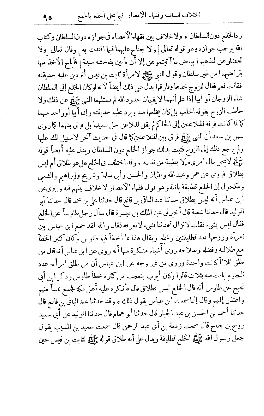 رَدَّ الْخُلْعَ دُونَ السُّلْطَانِ وَلَا خِلَافَ بَيْنَ فُقَهَاءِ الْأَمْصَارِ فِي جَوَازِهِ دُونَ السُّلْطَانِ وَكِتَابُ اللَّهِ يُوجِبُ جَوَازَهُ وَهُوَ قَوْله تَعَالَى فَلا جُناحَ عَلَيْهِما فِيمَا افْتَدَتْ بِهِ وَقَالَ تَعَالَى وَلا تَعْضُلُوهُنَّ لِتَذْهَبُوا بِبَعْضِ مَا آتَيْتُمُوهُنَّ إِلَّا أَنْ يَأْتِينَ بِفاحِشَةٍ مُبَيِّنَةٍ فَأَبَاحَ الْأَخْذَ مِنْهَا بِتَرَاضِيهِمَا مِنْ غَيْرِ سُلْطَانٍ