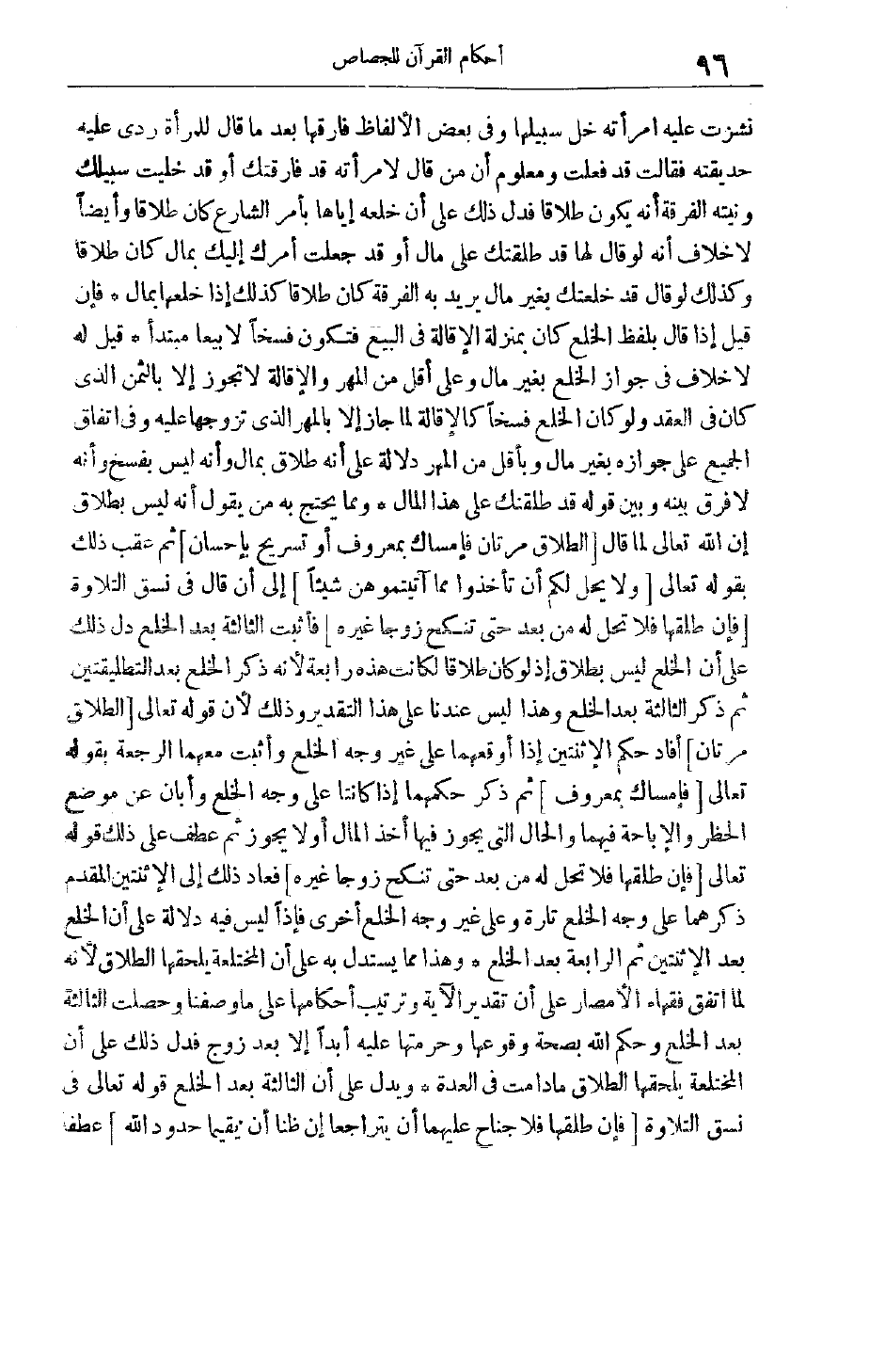 وَمَعْلُومٌ أَنَّ مَنْ قَالَ لَامْرَأَتِهِ قَدْ فَارَقْتُك أَوْ قَدْ خَلَّيْت سَبِيلَك وَنِيَّتُهُ الْفُرْقَةُ أَنَّهُ يَكُونُ طَلَاقًا فَدَلَّ ذَلِكَ عَلَى أَنَّ خُلْعَهُ إيَّاهَا بِأَمْرِ الشَّارِعِ كَانَ طَلَاقًا وَأَيْضًا لَا خِلَافَ أَنَّهُ لَوْ قَالَ لَهَا قَدْ طَلَّقْتُك عَلَى مَالٍ أَوْ قَدْ جَعَلْت أَمْرَك إلَيْك بِمَالٍ كَانَ طَلَاقًا وَكَذَلِكَ لَوْ قال قَدْ خَلَعْتُك بِغَيْرِ مَالٍ يُرِيدُ بِهِ الْفُرْقَةَ كَانَ طَلَاقًا كَذَلِكَ إذَا خَلَعَهَا بِمَالٍ فَإِنْ قِيلَ إذَا قَالَ بِلَفْظِ الْخُلْعِ كَانَ بِمَنْزِلَةِ الْإِقَالَةِ فِي الْبَيْعِ فَتَكُونُ فَسْخًا لَا بَيْعًا مُبْتَدَأً قِيلَ لَهُ لَا خِلَافَ فِي جَوَازِ الْخُلْعِ بِغَيْرِ مَالٍ وَعَلَى أَقَلَّ مِنْ الْمَهْرِ والإقالة لا تجوز إلا بِالثَّمَنِ الَّذِي كَانَ فِي الْعَقْدِ وَلَوْ كَانَ الْخُلْعُ فَسْخًا كَالْإِقَالَةِ لَمَا جَازَ إلَّا بِالْمَهْرِ الَّذِي تَزَوَّجَهَا عَلَيْهِ وَفِي اتِّفَاقِ الْجَمِيعِ عَلَى جَوَازِهِ بِغَيْرِ مَالٍ وَبِأَقَلَّ مِنْ الْمَهْرِ دَلَالَةٌ عَلَى أَنَّهُ طَلَاقٌ بِمَالٍ وَأَنَّهُ لَيْسَ بِفَسْخِ وَأَنَّهُ لَا فَرْقَ بَيْنَهُ وَبَيْنَ قَوْلِهِ قَدْ طلقنك عَلَى هَذَا الْمَالِ وَمِمَّا يَحْتَجُّ بِهِ مَنْ يقول أنه ليس بطلاق إن اللَّهَ تَعَالَى لَمَّا قَالَ الطَّلاقُ مَرَّتانِ فَإِمْساكٌ بِمَعْرُوفٍ أَوْ تَسْرِيحٌ بِإِحْسانٍ ثُمَّ عَقَّبَ ذَلِكَ بِقَوْلِهِ تَعَالَى وَلا يَحِلُّ لَكُمْ أَنْ تَأْخُذُوا مِمَّا آتَيْتُمُوهُنَّ شَيْئاً إلَى أَنْ قَالَ فِي نَسَقِ التِّلَاوَةِ فَإِنْ طَلَّقَها فَلا تَحِلُّ لَهُ مِنْ بَعْدُ حَتَّى تَنْكِحَ زَوْجاً غَيْرَهُ فَأَثْبَتَ الثَّالِثَةَ بَعْدَ الْخُلْعِ دَلَّ ذَلِكَ عَلَى أَنَّ الْخُلْعَ لَيْسَ بِطَلَاقٍ إذْ لَوْ كَانَ طَلَاقًا لَكَانَتْ هَذِهِ رَابِعَةً لِأَنَّهُ ذَكَرَ الْخُلْعَ بَعْدَ التَّطْلِيقَتَيْنِ ثُمَّ ذَكَرَ الثَّالِثَةَ بَعْدَ الْخُلْعِ وَهَذَا لَيْسَ عِنْدَنَا عَلَى هَذَا التَّقْدِيرِ وَذَلِكَ لأن قوله تعالى الطَّلاقُ مَرَّتانِ أفاد حكم الاثنتين إذَا أَوْقَعَهُمَا عَلَى غَيْرِ وَجْهِ الْخُلْعِ وَأَثْبَتَ معهما الرجعة بقوله تعالى فَإِمْساكٌ بِمَعْرُوفٍ ثُمَّ ذَكَرَ حُكْمَهُمَا إذَا كَانَتَا عَلَى وَجْهِ الْخُلْعِ وَأَبَانَ عَنْ مَوْضِعِ الْحَظْرِ وَالْإِبَاحَةِ فِيهِمَا وَالْحَالِ الَّتِي يَجُوزُ فِيهَا أَخْذُ الْمَالِ أَوْ لَا يَجُوزُ ثُمَّ عَطَفَ عَلَى ذَلِكَ قَوْله تَعَالَى فَإِنْ طَلَّقَها فَلا تَحِلُّ لَهُ مِنْ بَعْدُ حَتَّى تَنْكِحَ زَوْجاً غَيْرَهُ
