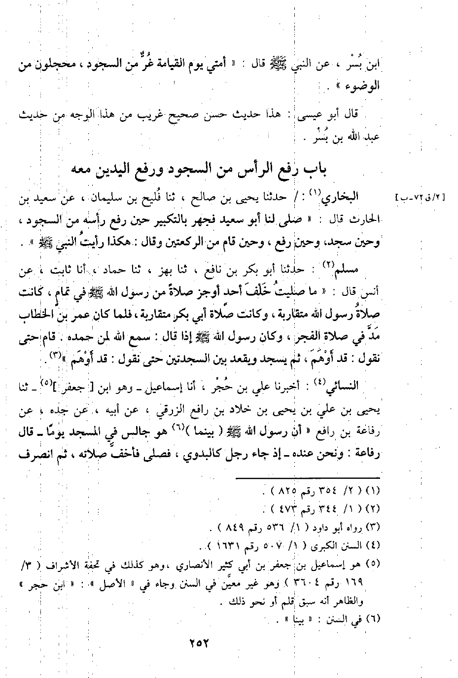 النَّسَائِيّ: أخبرنَا عَليّ بن حجر، أَنا إِسْمَاعِيل - وَهُوَ ابْن [جَعْفَر]- ثَنَا يحيى بن عَليّ بن يحيى بن خَلاد بن رَافع الزرقي، عَن أَبِيه، عَن جده، عَن رِفَاعَة بن رَافع " أَن رَسُول اللَّهِ - صَلَّى اللَّهُ عَلَيْهِ وَسَلَّم َ - (بَيْنَمَا) هُوَ جَالس فِي الْمَسْجِد يَوْمًا - قَالَ رِفَاعَة: وَنحن عِنْده - إِذْ جَاءَ رجل كالبدوي، فصلى فأخف صلَاته، ثمَّ انْصَرف