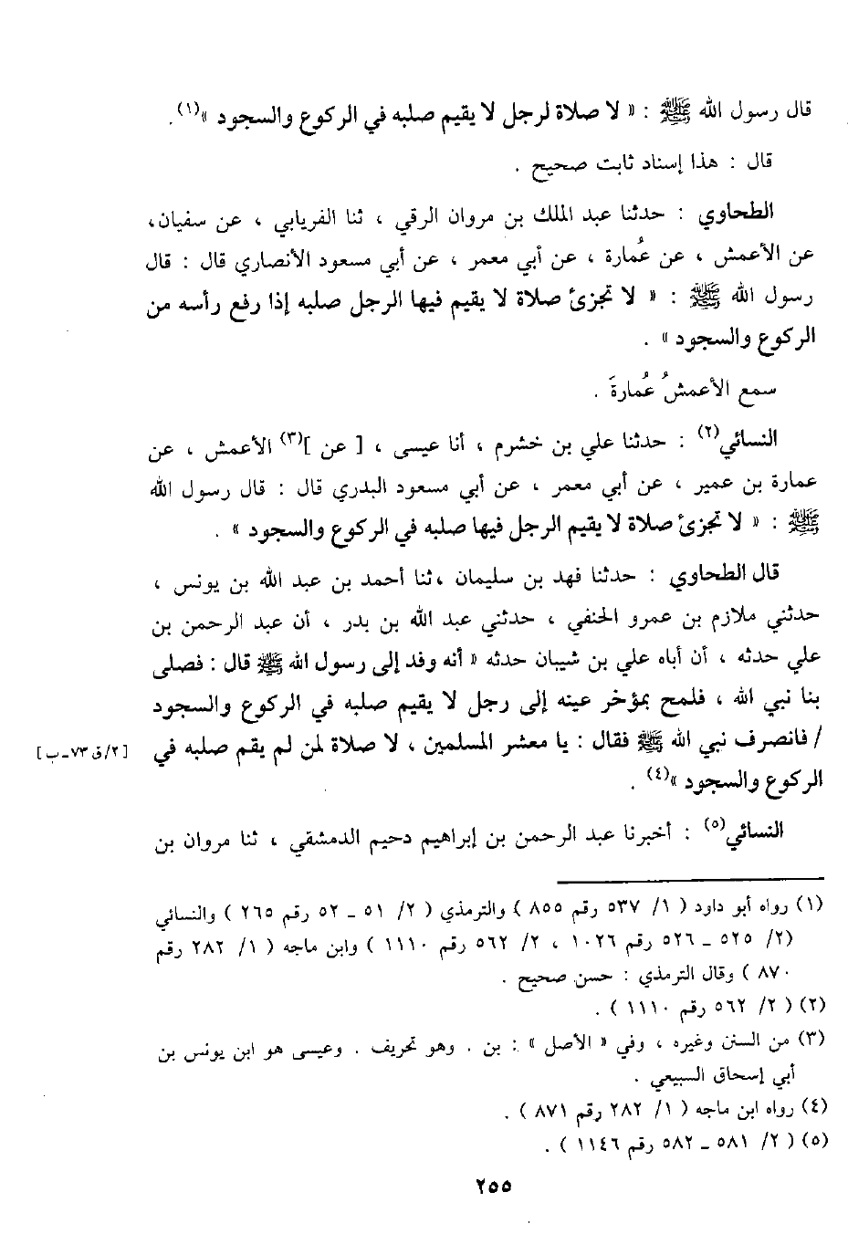 الطَّحَاوِيّ: حَدثنَا عبد الْملك بن مَرْوَان الرقي، ثَنَا الْفرْيَابِيّ، عَن سُفْيَان، عَن الْأَعْمَش، عَن عمَارَة، عَن أبي معمر، عَن أبي مَسْعُود الْأنْصَارِيّ قَالَ: قَالَ رَسُول اللَّهِ - صَلَّى اللَّهُ عَلَيْهِ وَسَلَّم َ -: " لَا تُجزئ صَلَاة لَا يُقيم فِيهَا الرجل صلبه إِذا رفع رَأسه من الرُّكُوع وَالسُّجُود ".