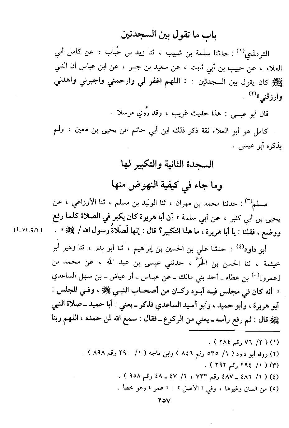 التِّرْمِذِيّ: حَدثنَا سَلمَة بن شبيب، ثَنَا زيد بن حباب، عَن كَامِل أبي الْعَلَاء، عَن حبيب بن أبي ثَابت، عَن سعيد بن جُبَير، عَن ابْن عَبَّاس أَن النَّبِي - صَلَّى اللَّهُ عَلَيْهِ وَسَلَّم َ - كَانَ يَقُول بَين السَّجْدَتَيْنِ: " اللَّهُمَّ اغْفِر لي وارحمني واجبرني واهدني وارزقني ".