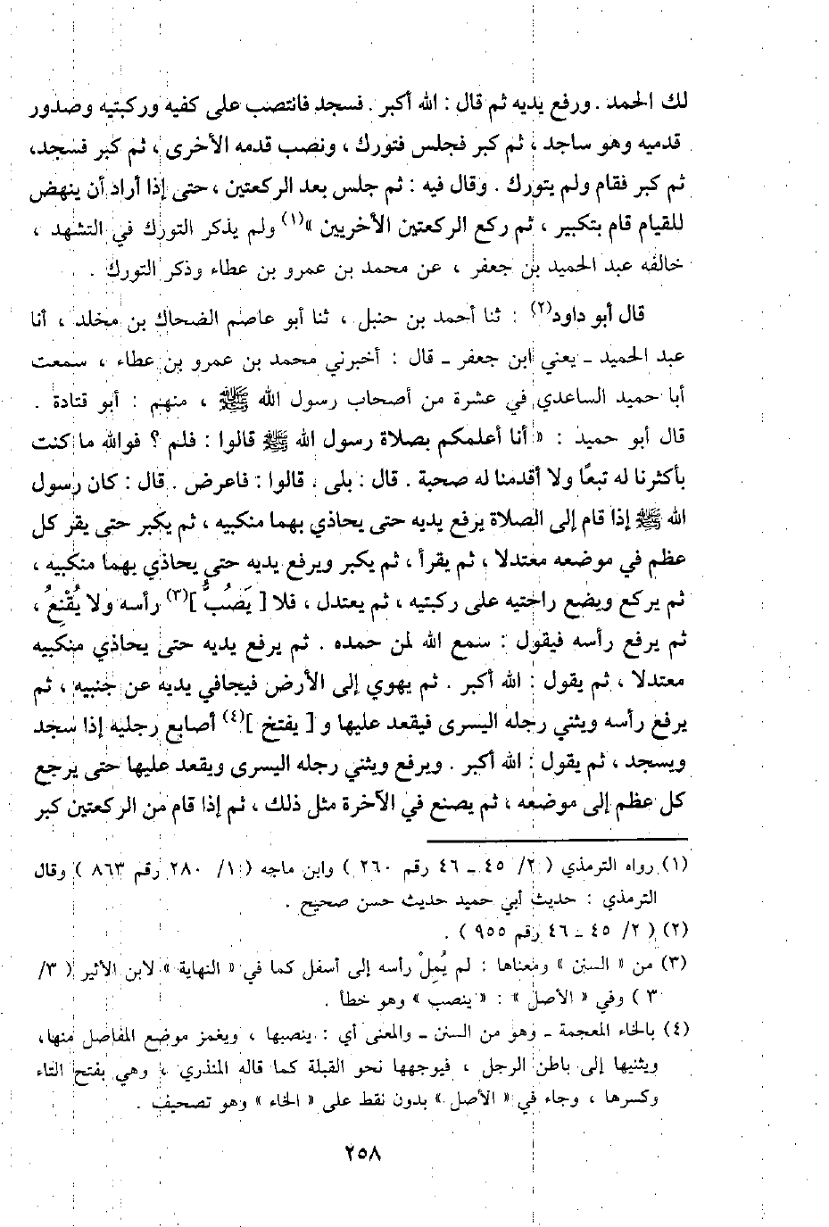 قَالَ أَبُو دَاوُد: ثَنَا أَحْمد بن حَنْبَل، ثَنَا أَبُو عَاصِم الضَّحَّاك بن مخلد، أَنا عبد الحميد - يَعْنِي ابْن جَعْفَر - قَالَ: أَخْبرنِي مُحَمَّد بن عَمْرو بن عَطاء، سَمِعت أَبَا حميد السَّاعِدِيّ فِي عشرَة من أَصْحَاب رَسُول اللَّهِ - صَلَّى اللَّهُ عَلَيْهِ وَسَلَّم َ -، مِنْهُم: أَبُو قَتَادَة. قَالَ أَبُو حميد: " أَنا أعلمكُم بِصَلَاة رَسُول اللَّهِ - صَلَّى اللَّهُ عَلَيْهِ وَسَلَّم َ - قَالُوا: فَلم؟ فوَاللَّه مَا كنت بأكثرنا لَهُ تبعا وَلَا أقدمنا لَهُ صُحْبَة. قَالَ: بلَى. قَالُوا: فَأَعْرض. قَالَ: كَانَ رَسُول اللَّهِ - صَلَّى اللَّهُ عَلَيْهِ وَسَلَّم َ - إِذا قَامَ إِلَيّ الصَّلَاة يرفع يَدَيْهِ حَتَّى يُحَاذِي بهما مَنْكِبَيْه، ثمَّ يكبر حَتَّى يقر كل عظم فِي مَوْضِعه معتدلا، ثمَّ يقْرَأ، ثمَّ يكبر وَيرْفَع يَدَيْهِ حَتَّى يُحَاذِي بهما مَنْكِبَيْه، ثمَّ يرْكَع وَيَضَع راحتيه على رُكْبَتَيْهِ، ثمَّ يعتدل، فَلَا [يصب] رَأسه وَلَا يقنع، ثمَّ يرفع رَأسه فَيَقُول: سمع اللَّهِ لمن حَمده. ثمَّ يرفع يَدَيْهِ حَتَّى يُحَاذِي مَنْكِبَيْه معتدلا، ثمَّ يَقُول: اللَّهِ أكبر. ثمَّ يهوي إِلَى الأَرْض فيجافي يَدَيْهِ عَن جَنْبَيْهِ، ثمَّ يرفع رَأسه ويثني رجله الْيُسْرَى فيقعد عَلَيْهَا و [يفتخ] أَصَابِع رجلَيْهِ إِذا سجد وَيسْجد، ثمَّ يَقُول: اللَّهِ أكبر. وَيرْفَع ويثني رجله الْيُسْرَى وَيقْعد عَلَيْهَا حَتَّى يرجع كل عظم إِلَى مَوْضِعه، ثمَّ يصنع فِي الْآخِرَة مثل ذَلِك، ثمَّ إِذا قَامَ من الرَّكْعَتَيْنِ كبر