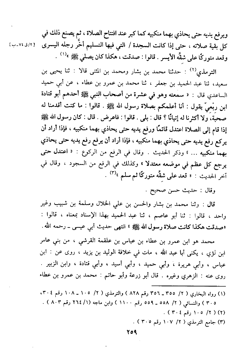 التِّرْمِذِيّ: حَدثنَا مُحَمَّد بن بشار وَمُحَمّد بن الْمثنى قَالَا: ثَنَا يحيى بن سعيد، ثَنَا عبد الحميدج بن جَعْفَر، ثَنَا مُحَمَّد بن عَمْرو بن عَطاء، عَن أبي حميد السَّاعِدِيّ قَالَ: " سمعته وَهُوَ فِي عشرَة من أَصْحَاب النَّبِي - صَلَّى اللَّهُ عَلَيْهِ وَسَلَّم َ - أحدهم أَبُو قَتَادَة ابْن ربعي يَقُول: أَنا أعلمكُم بِصَلَاة رَسُول اللَّهِ - صَلَّى اللَّهُ عَلَيْهِ وَسَلَّم َ -. قَالُوا: مَا كنت أقدمنا لَهُ صُحْبَة، وَلَا أكثرنا لَهُ إتيانا؟ قَالَ: بلَى. قَالُوا: فَأَعْرض. قَالَ كَانَ رَسُول الله - صَلَّى اللَّهُ عَلَيْهِ وَسَلَّم َ - إِذا قَامَ إِلَى الصَّلَاة اعتدل قَائِما وَرفع يَدَيْهِ حَتَّى يُحَاذِي بهما مَنْكِبَيْه، فَإِذا أَرَادَ أَن يرْكَع رفع يَدَيْهِ حَتَّى يُحَاذِي بهما مَنْكِبَيْه، فَإِذا أَرَادَ أَن يرفع رفع يَدَيْهِ حَتَّى يُحَاذِي بهما مَنْكِبَيْه ... . " وَذكر الحَدِيث. وَقَالَ فِي الرّفْع من الرُّكُوع: اعتدل حَتَّى يرجع كل عظم فِي مَوْضِعه معتدلا " وَكَذَلِكَ فِي الرّفْع من السُّجُود، وَقَالَ فِي آخر الحَدِيث: " قعد على شقَّه متوركا ثمَّ سلم ".