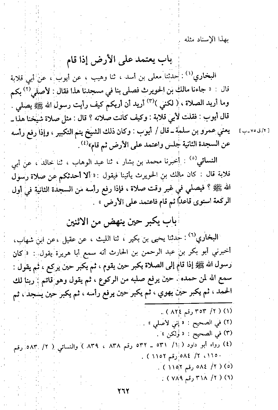 البُخَارِيّ: حَدثنَا مُعلى بن أَسد، ثَنَا وهيب، عَن أَيُّوب، عَن أبي قلَابَة قَالَ: " جَاءَنَا مَالك بن الْحُوَيْرِث فصلى بِنَا فِي مَسْجِدنَا هَذَا فَقَالَ: لأصلي بكم وَمَا أُرِيد الصَّلَاة، (لكني) أُرِيد أَن أريكم كَيفَ رَأَيْت رَسُول اللَّهِ - صَلَّى اللَّهُ عَلَيْهِ وَسَلَّم َ - يُصَلِّي. قَالَ أَيُّوب: فَقلت لأبي قلَابَة: وَكَيف كَانَت صلَاته؟ قَالَ: مثل صَلَاة شَيخنَا هَذَا - يَعْنِي عَمْرو بن سَلمَة - قَالَ / أَيُّوب: وَكَانَ ذَلِك الشَّيْخ يتم التَّكْبِير، وَإِذا رفع رَأسه عَن السَّجْدَة الثَّانِيَة جلس وَاعْتمد على الأَرْض ثمَّ قَامَ ".