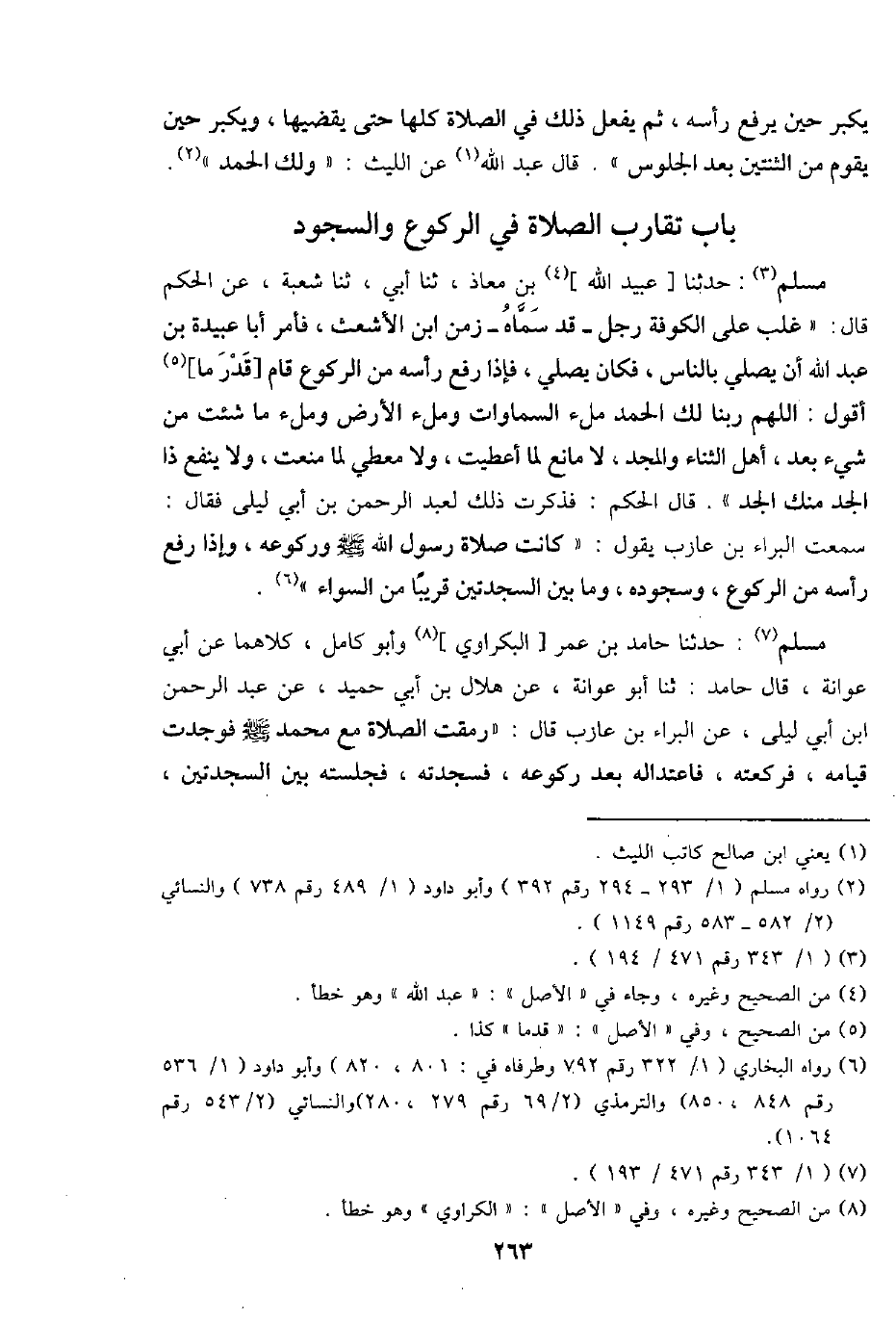 مُسلم: حَدثنَا حَامِد بن عمر [البكراوي] وَأَبُو كَامِل كِلَاهُمَا عَن أبي عوَانَة، قَالَ حَامِد: ثَنَا أَبُو عوَانَة، عَن هِلَال بن أبي حميد، عَن عبد الرَّحْمَن ابْن أبي ليلى، عَن الْبَراء بن عَازِب قَالَ: " رمقت الصَّلَاة مَعَ مُحَمَّد - صَلَّى اللَّهُ عَلَيْهِ وَسَلَّم َ - فَوجدت قِيَامه، فركعته، فاعتداله بعد رُكُوعه، فسجدته، فجلسته بَين السَّجْدَتَيْنِ،