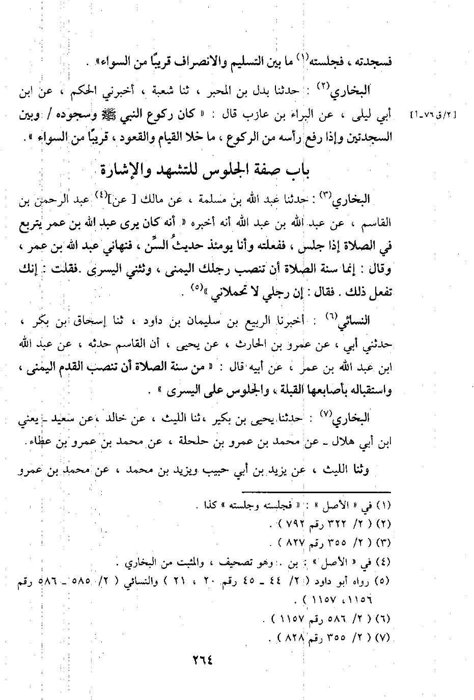 البُخَارِيّ: حَدثنَا عبد اللَّهِ بن مسلمة، عَن مَالك [عَن] عبد الرَّحْمَن بن الْقَاسِم، عَن عبد اللَّهِ بن عبد اللَّهِ أَنه أخبرهُ " أَنه كَانَ يرى عبد اللَّهِ بن عمر يتربع فِي الصَّلَاة إِذا جلس، ففعلته وَأَنا يَوْمئِذٍ حَدِيث السن، فنهاني عبد اللَّهِ بن عمر، وَقَالَ: إِنَّمَا سنة الصَّلَاة أَن تنصب رجلك الْيُمْنَى، وثثني الْيُسْرَى. فَقلت: إِنَّك تفعل ذَلِك. فَقَالَ: إِن رجْلي لَا تحملاني ".