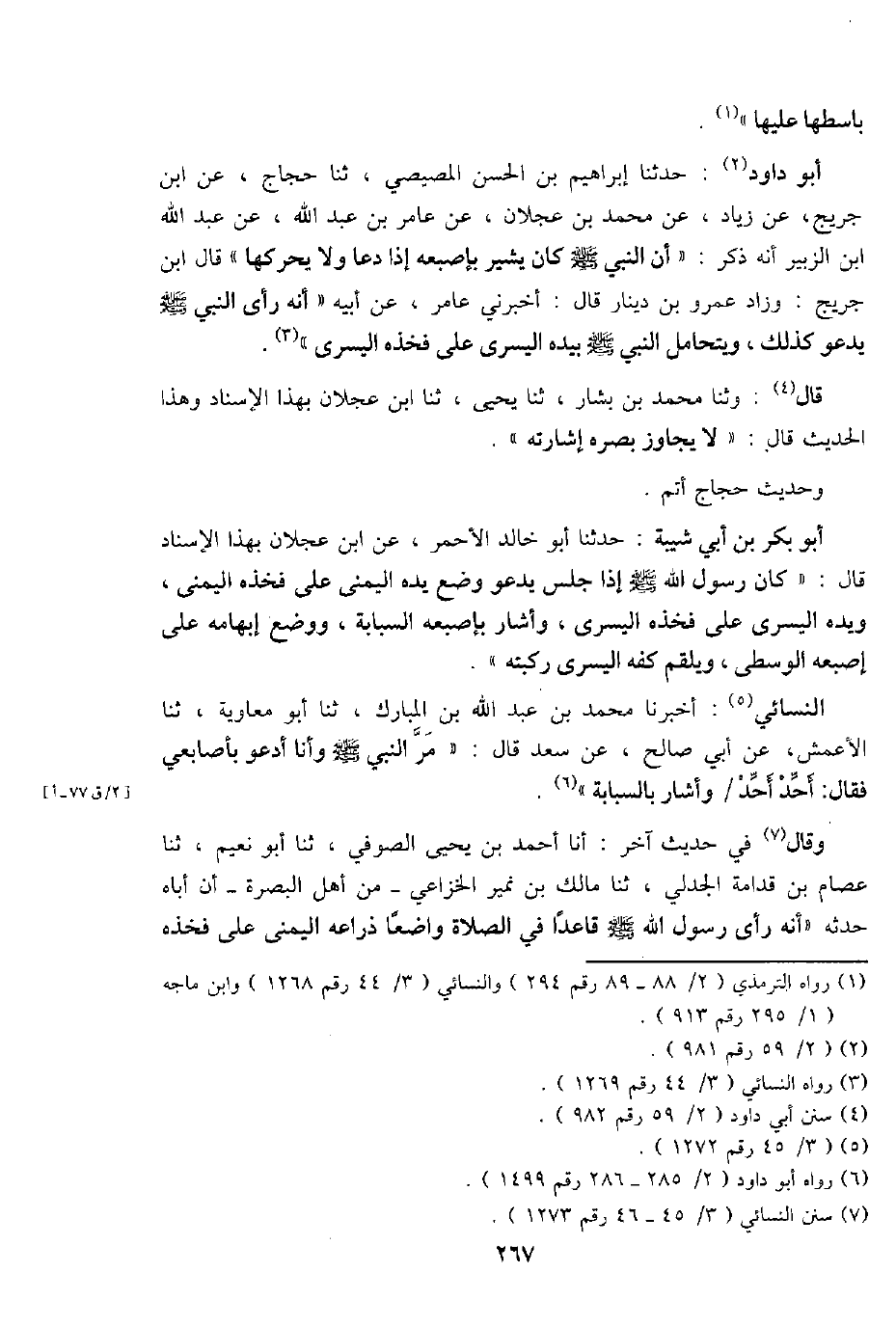 أَبُو دَاوُد: حَدثنَا إِبْرَاهِيم بن الْحسن المصِّيصِي، ثَنَا حجاج، عَن ابْن جريج، عَن زِيَاد، عَن مُحَمَّد بن عجلَان، عَن عَامر بن عبد اللَّهِ، عَن عبد اللَّهِ ابْن الزبير أَنه ذكر: " أَن النَّبِي - صَلَّى اللَّهُ عَلَيْهِ وَسَلَّم َ - كَانَ يُشِير بإصبعه إِذا دَعَا وَلَا يحركها " قَالَ ابْن جريج: وَزَاد عَمْرو بن دِينَار قَالَ: أَخْبرنِي عَامر، عَن أَبِيه " أَنه رأى النَّبِي - صَلَّى اللَّهُ عَلَيْهِ وَسَلَّم َ - يَدْعُو كَذَلِك، ويتحامل النَّبِي - صَلَّى اللَّهُ عَلَيْهِ وَسَلَّم َ - بِيَدِهِ الْيُسْرَى على فَخذه الْيُسْرَى ".