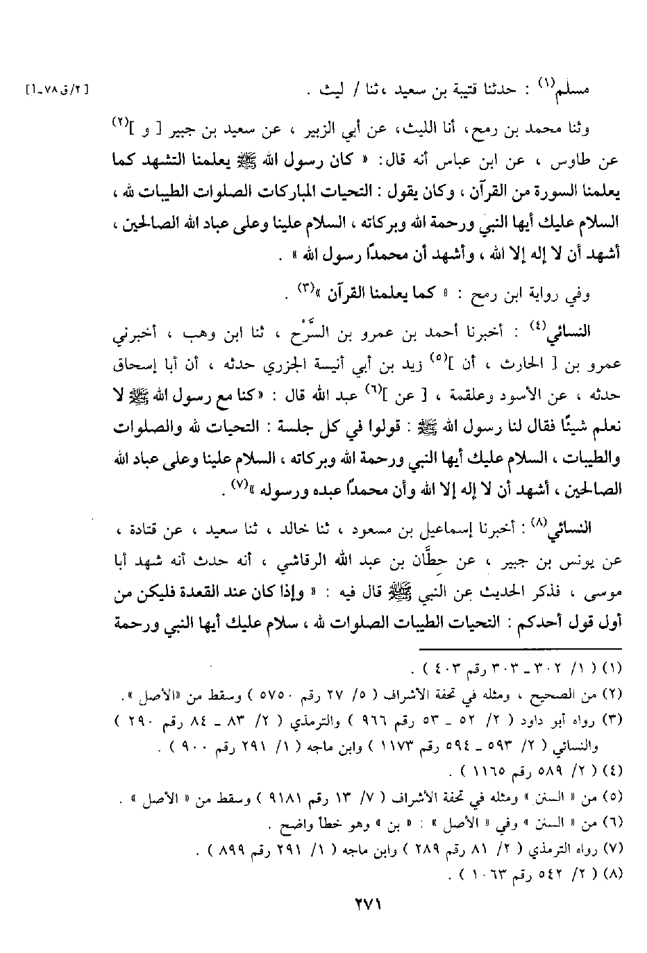وثنا مُحَمَّد بن رمح، أَنا اللَّيْث، عَن أبي الزبير، عَن سعيد بن جُبَير [و] عَن طَاوس، عَن ابْن عَبَّاس أَنه قَالَ: " كَانَ رَسُول اللَّهِ - صَلَّى اللَّهُ عَلَيْهِ وَسَلَّم َ - يعلمنَا التَّشَهُّد كَمَا يعلمنَا السُّورَة من الْقُرْآن، وَكَانَ يَقُول: التَّحِيَّات المباركات الصَّلَوَات الطَّيِّبَات لله، السَّلَام عَلَيْك أَيهَا النَّبِي وَرَحْمَة اللَّهِ وَبَرَكَاته، السَّلَام علينا وعَلى عباد اللَّهِ الصَّالِحين، أشهد أَن لَا إِلَه إِلَّا اللَّهِ، وَأشْهد أَن مُحَمَّدًا رَسُول الله ".