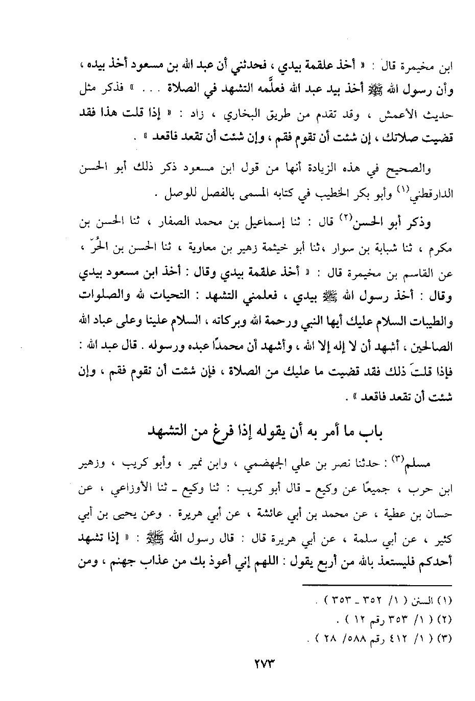 وَذكر أَبُو الْحسن قَالَ: ثَنَا إِسْمَاعِيل بن مُحَمَّد الصفار، ثَنَا الْحسن بن مكرم، ثَنَا شَبابَة بن سوار، ثَنَا أَبُو خَيْثَمَة زُهَيْر بن مُعَاوِيَة، ثَنَا الْحسن بن الْحر، عَن الْقَاسِم بن مخيمرة قَالَ: " أَخذ عَلْقَمَة بيَدي وَقَالَ: أَخذ ابْن مَسْعُود بيَدي وَقَالَ: أَخذ رَسُول الله - صَلَّى اللَّهُ عَلَيْهِ وَسَلَّم َ - بيَدي، فعلمني التَّشَهُّد: التَّحِيَّات لله والصلوات والطيبات السَّلَام عَلَيْك أَيهَا النَّبِي وَرَحْمَة اللَّهِ وَبَرَكَاته، السَّلَام علينا وعَلى عباد اللَّهِ الصَّالِحين، أشهد أَن لَا إِلَه إِلَّا اللَّهِ، وَأشْهد أَن مُحَمَّدًا عَبده وَرَسُوله. قَالَ عبد اللَّهِ: فَإِذا قلت ذَلِك فقد قضيت مَا عَلَيْك من الصَّلَاة، فَإِن شِئْت أَن تقوم فَقُمْ، وَإِن شِئْت أَن تقعد فَاقْعُدْ ".