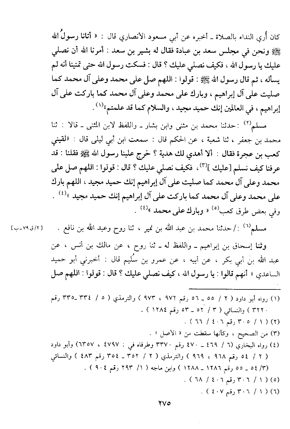 مُسلم: حَدثنَا مُحَمَّد بن مثنى وَابْن بشار - وَاللَّفْظ لِابْنِ الْمثنى - قَالَا: ثَنَا مُحَمَّد بن جَعْفَر، ثَنَا شُعْبَة، عَن الحكم قَالَ: سَمِعت ابْن أبي ليلى قَالَ " لَقِيَنِي كَعْب بن عجْرَة فَقَالَ: أَلا أهدي لَك هَدِيَّة؟ خرج علينا رَسُول اللَّهِ - صَلَّى اللَّهُ عَلَيْهِ وَسَلَّم َ - فَقُلْنَا: قد عرفنَا كَيفَ نسلم [عَلَيْك] ، فَكيف نصلي عَلَيْك؟ قَالَ: قُولُوا: اللَّهُمَّ صل على مُحَمَّد وعَلى آل مُحَمَّد كَمَا صليت على آل إِبْرَاهِيم إِنَّك حميد مجيد، اللَّهُمَّ بَارك على مُحَمَّد وعَلى آل مُحَمَّد كَمَا كَمَا باركت على آل إِبْرَاهِيم إِنَّك حميد مجيد ". وَفِي بعض طرق كَعْب " وَبَارك على مُحَمَّد ".