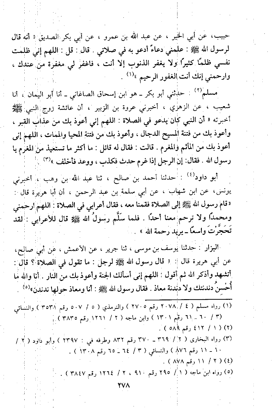 حبيب عَن أبي الْخَيْر، عَن عبد اللَّهِ بن عَمْرو، عَن أبي بكر الصّديق " أَنه قَالَ لرَسُول اللَّهِ - صَلَّى اللَّهُ عَلَيْهِ وَسَلَّم َ -: عَلمنِي دُعَاء أَدْعُو بِهِ فِي صَلَاتي. قَالَ: قل: اللَّهُمَّ إِنِّي ظلمت نَفسِي ظلما كثيرا وَلَا يغْفر الذُّنُوب إِلَّا أَنْت، فَأغْفِر لي مغْفرَة من عنْدك، وارحمني إِنَّك أَنْت الغفور الرَّحِيم ".