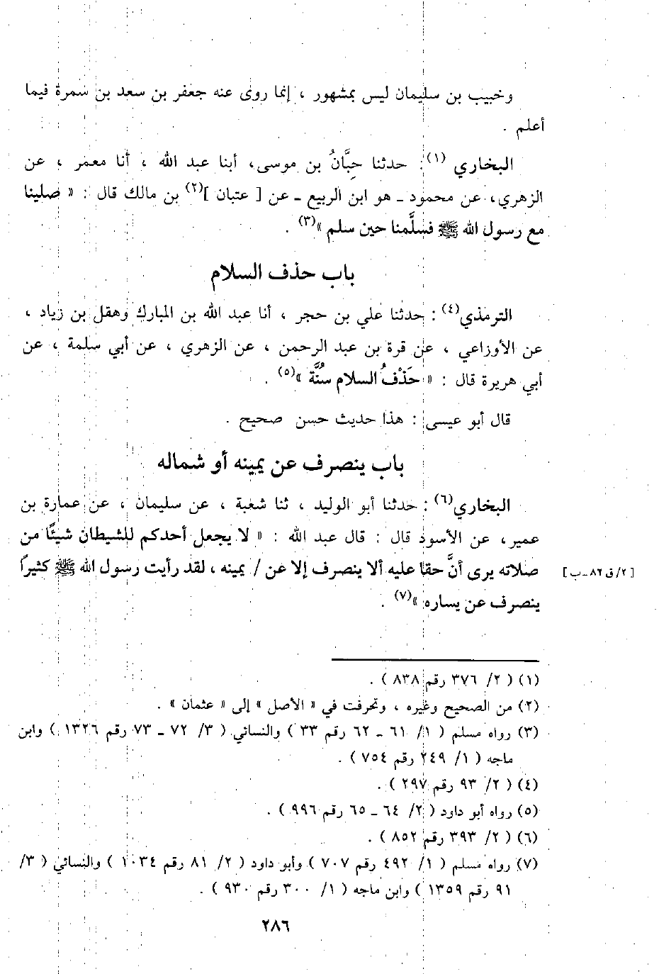 التِّرْمِذِيّ: حَدثنَا عَليّ بن حجر، أَنا عبد اللَّهِ بن الْمُبَارك وهقل بن زِيَاد، عَن الْأَوْزَاعِيّ، عَن قُرَّة بن عبد الرَّحْمَن، عَن الزُّهْرِيّ، عَن أبي سَلمَة، عَن أبي هُرَيْرَة قَالَ: " حذف السَّلَام سنة ".