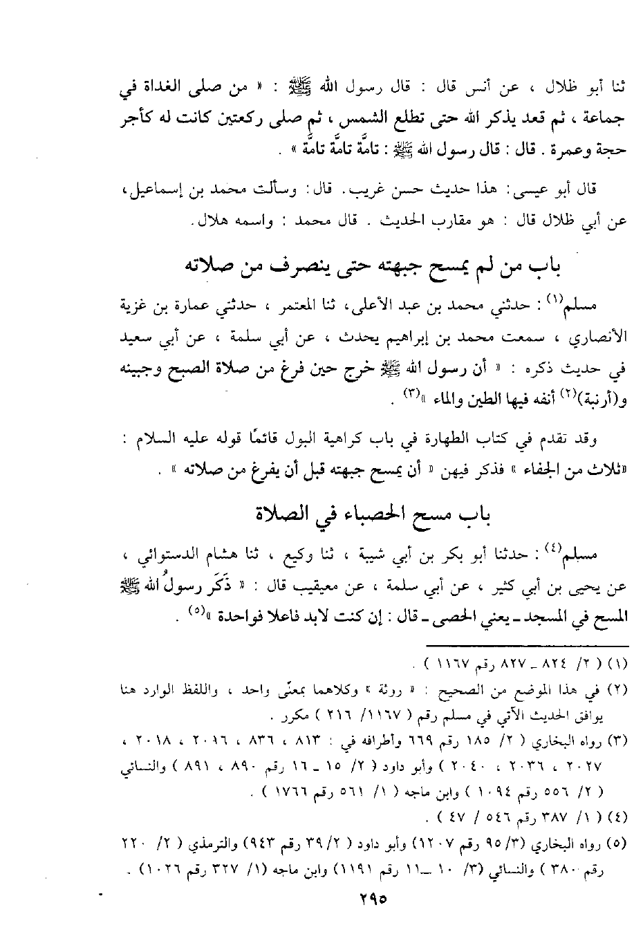 مُسلم: حَدثنَا أَبُو بكر بن أبي شيبَة، ثَنَا وَكِيع، ثَنَا هِشَام الدستوَائي، عَن يحيى بن أبي كثير، عَن أبي سَلمَة، عَن معيقيب قَالَ: " ذكر رَسُول اللَّهِ - صَلَّى اللَّهُ عَلَيْهِ وَسَلَّم َ - الْمسْح فِي الْمَسْجِد - يَعْنِي الْحَصَى - قَالَ: إِن كنت لابد فَاعِلا فَوَاحِدَة ".