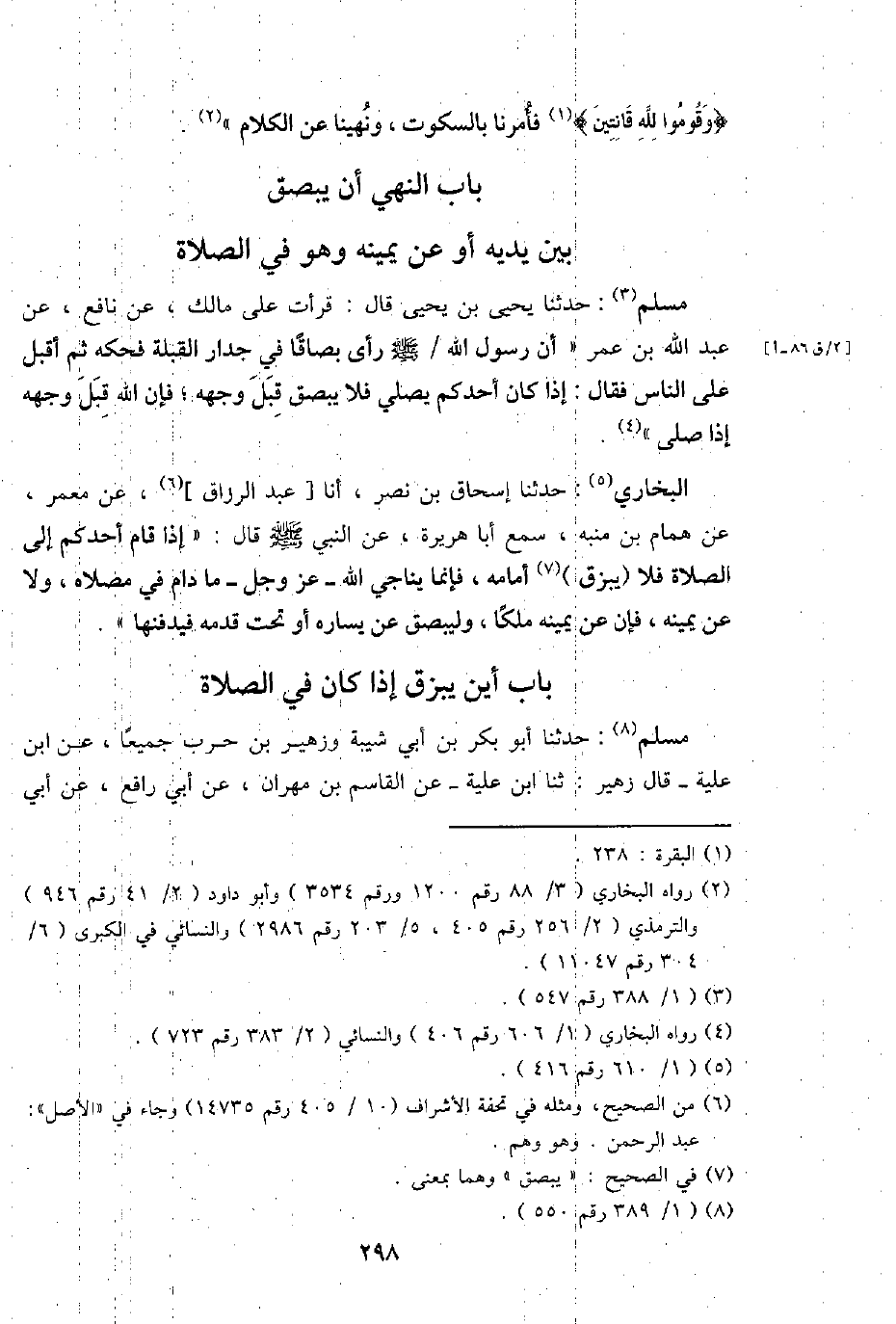 مُسلم: حَدثنَا يحيى بن يحيى قَالَ: قَرَأت على مَالك، عَن نَافِع، عَن عبد اللَّهِ بن عمر " أَن رَسُول اللَّهِ / - صَلَّى اللَّهُ عَلَيْهِ وَسَلَّم َ - رأى بصاقا فِي جِدَار الْقبْلَة فحكه ثمَّ أقبل على النَّاس فَقَالَ: إِذا كَانَ أحدكُم يُصَلِّي فَلَا يبصق قبل وَجهه؛ فَإِن اللَّهِ قبل وَجهه إِذا صلى ".