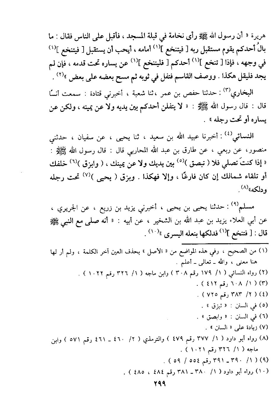 مُسلم: حَدثنَا يحيى بن يحيى، أَخْبرنِي يزِيد بن زُرَيْع، عَن الْجريرِي، عَن أبي الْعَلَاء يزِيد بن عبد اللَّهِ بن الشخير، عَن أَبِيه: " أَنه صلى مَعَ النَّبِي - صَلَّى اللَّهُ عَلَيْهِ وَسَلَّم َ - قَالَ: [فتنخع] فدلكها بنعله الْيُسْرَى ".