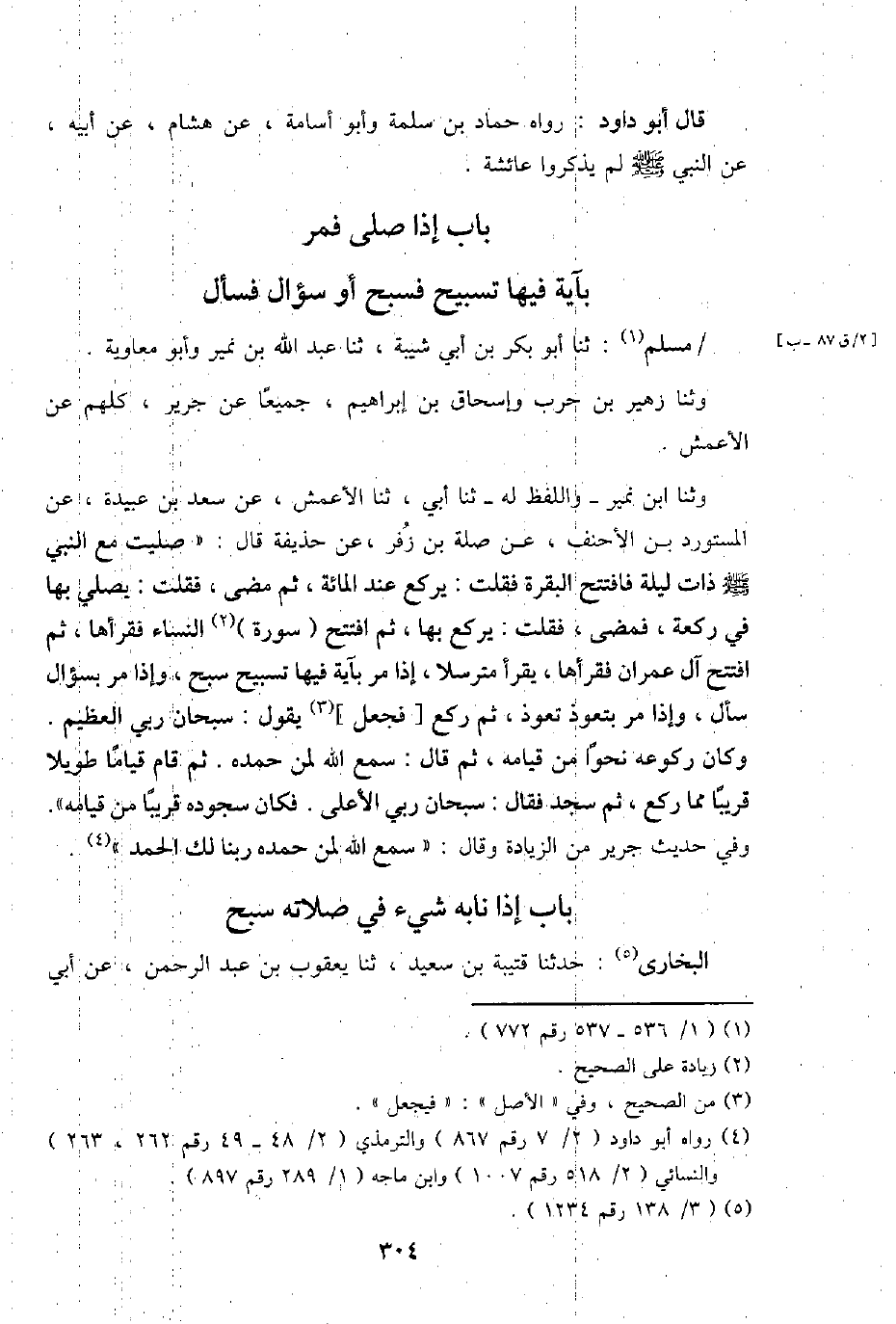 وثنا ابْن نمير - وَاللَّفْظ لَهُ - ثَنَا أبي، ثَنَا الْأَعْمَش، عَن سعد بن عُبَيْدَة، عَن الْمُسْتَوْرد بن الْأَحْنَف، عَن صلَة بن زفر، عَن حُذَيْفَة قَالَ: " صليت مَعَ النَّبِي - صَلَّى اللَّهُ عَلَيْهِ وَسَلَّم َ - ذَات لَيْلَة فَافْتتحَ الْبَقَرَة فَقلت: يرْكَع عِنْد الْمِائَة، ثمَّ مضى، فَقلت: يُصَلِّي بهَا فِي رَكْعَة، فَمضى، فَقلت: يرْكَع بهَا، ثمَّ افْتتح (سُورَة) النِّسَاء فقرأها، ثمَّ افْتتح آل عمرَان فقرأها، يقْرَأ مترسلا، إِذا مر بِآيَة فِيهَا تَسْبِيح سبح، وَإِذا مر بسؤال سَأَلَ، وَإِذا مر يتَعَوَّذ تعوذ، ثمَّ ركع [فَجعل] يَقُول: سُبْحَانَ رَبِّي الْعَظِيم. وَكَانَ رُكُوعه نَحوا من قِيَامه، ثمَّ قَالَ: سمع اللَّهِ لمن حَمده. ثمَّ قَامَ قيَاما طَويلا قَرِيبا مِمَّا ركع، ثمَّ سجد فَقَالَ: سُبْحَانَ رَبِّي الْأَعْلَى. فَكَانَ سُجُوده قَرِيبا من قِيَامه ". وَفِي حَدِيث جرير من الزِّيَادَة وَقَالَ: " سمع اللَّهِ لمن حَمده رَبنَا لَك الْحَمد ".