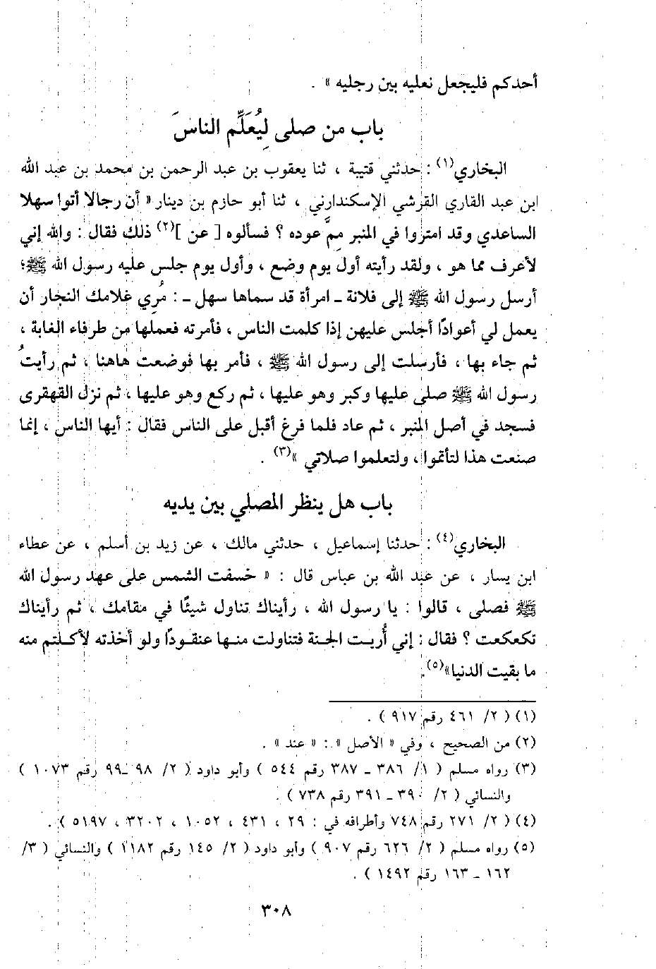 البُخَارِيّ: حَدثنِي قُتَيْبَة، ثَنَا يَعْقُوب بن عبد الرَّحْمَن بن مُحَمَّد بن عبد اللَّهِ ابْن عبد الْقَارِي الْقرشِي الإسكندارني، ثَنَا أَبُو حَازِم بن دِينَار " أَن رجَالًا أَتَوا سهلا السَّاعِدِيّ وَقد امتروا فِي الْمِنْبَر مِم عوده؟ فَسَأَلُوهُ [عَن] ذَلِك فَقَالَ: وَالله إِنِّي لأعرف مِمَّا هُوَ، وَلَقَد رَأَيْته أول يَوْم وضع، وَأول يَوْم جلس عَلَيْهِ رَسُول اللَّهِ - صَلَّى اللَّهُ عَلَيْهِ وَسَلَّم َ - أرسل رَسُول اللَّهِ - صَلَّى اللَّهُ عَلَيْهِ وَسَلَّم َ - إِلَى فُلَانَة - امْرَأَة قد سَمَّاهَا سهل -: مري غلامك النجار أَن يعْمل لي أعوادا أَجْلِس عَلَيْهِنَّ إِذا كلمت النَّاس، / فَأَمَرته فعملها من طرفاء الغابة، ثمَّ جَاءَ بهَا، فَأرْسلت إِلَى رَسُول اللَّهِ - صَلَّى اللَّهُ عَلَيْهِ وَسَلَّم َ -، فَأمر بهَا فَوضعت هَا هُنَا، ثمَّ رَأَيْت رَسُول اللَّهِ - صَلَّى اللَّهُ عَلَيْهِ وَسَلَّم َ - صلى عَلَيْهَا وَكبر وَهُوَ عَلَيْهَا، ثمَّ ركع وَهُوَ عَلَيْهَا، ثمَّ نزل الْقَهْقَرِي فَسجدَ فِي أصل الْمِنْبَر، ثمَّ عَاد فَلَمَّا فرغ أقبل على النَّاس فَقَالَ: أَيهَا النَّاس، إِنَّمَا صنعت هَذَا لتأتموا، ولتعلموا صَلَاتي ".
