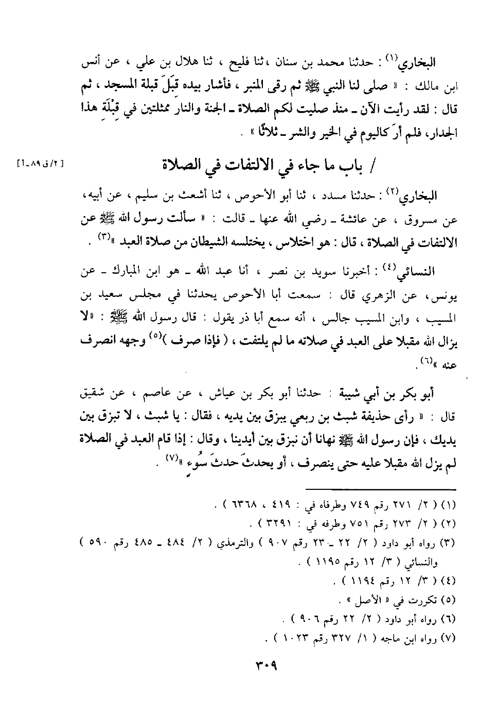 البُخَارِيّ: حَدثنَا مُسَدّد، ثَنَا أَبُو الْأَحْوَص، ثَنَا أَشْعَث بن سليم، عَن أَبِيه، عَن مَسْرُوق، عَن عَائِشَة - رَضِي اللَّهِ عَنْهَا - قَالَت: " سَأَلت رَسُول اللَّهِ - صَلَّى اللَّهُ عَلَيْهِ وَسَلَّم َ - عَن الِالْتِفَات فِي الصَّلَاة، قَالَ: هُوَ اختلاس، يختلسه الشَّيْطَان من صَلَاة العَبْد ".