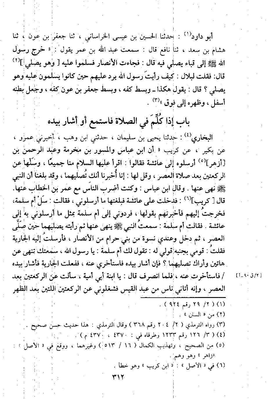 أَبُو دَاوُد: حَدثنَا الْحُسَيْن بن عِيسَى الْخُرَاسَانِي، ثَنَا جَعْفَر بن عون، ثَنَا هِشَام بن سعد، ثَنَا نَافِع قَالَ: سَمِعت عبد اللَّهِ بن عمر يَقُول: " خرج رَسُول اللَّهِ - صَلَّى اللَّهُ عَلَيْهِ وَسَلَّم َ - إِلَى قبَاء يُصَلِّي فِيهِ قَالَ: فَجَاءَت الْأَنْصَار فَسَلمُوا عَلَيْهِ [وَهُوَ يُصَلِّي] قَالَ: فَقلت لِبلَال: كَيفَ رَأَيْت رَسُول اللَّهِ يرد عَلَيْهِم حِين كَانُوا يسلمُونَ عَلَيْهِ وَهُوَ يُصَلِّي؟ قَالَ: يَقُول هَكَذَا - وَبسط كَفه، وَبسط جَعْفَر بن عون كَفه، وَجعل بَطْنه أَسْفَل، وظهره إِلَى فَوق ".