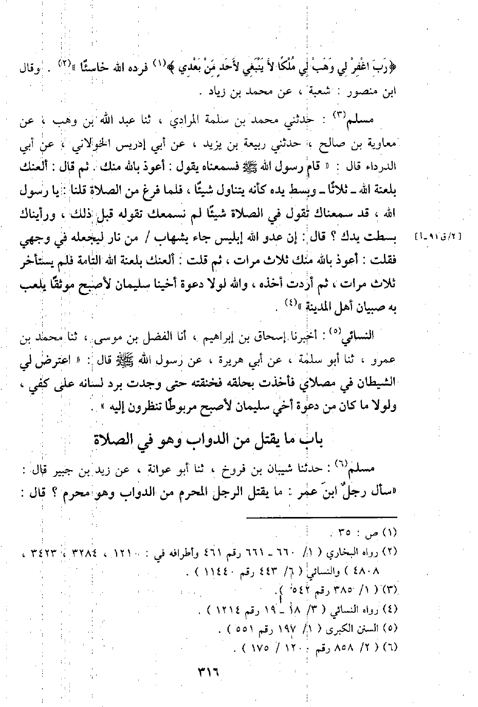 مُسلم: حَدثنِي مُحَمَّد بن سَلمَة الْمرَادِي، ثَنَا عبد اللَّهِ بن وهب، عَن مُعَاوِيَة بن صَالح، حَدثنِي ربيعَة بن يزِيد، عَن أبي إِدْرِيس الْخَولَانِيّ، عَن أبي الدَّرْدَاء قَالَ: " قَامَ رَسُول اللَّهِ - صَلَّى اللَّهُ عَلَيْهِ وَسَلَّم َ - فسمعناه يَقُول: أعوذ بِاللَّه مِنْك. ثمَّ قَالَ: ألعنك بلعنة اللَّهِ - ثَلَاثًا - وَبسط يَده كَأَنَّهُ يتَنَاوَل شَيْئا، فَلَمَّا فرغ من الصَّلَاة قُلْنَا: يَا رَسُول اللَّهِ، قد سمعناك تَقول فِي الصَّلَاة شَيْئا لم نسمعك تَقوله قبل ذَلِك، ورأيناك بسطت يدك؟ قَالَ: إِن عَدو اللَّهِ إِبْلِيس جَاءَ بشهاب / من نَار ليجعله فِي وَجْهي فَقلت: أعوذ بِاللَّه مِنْك ثَلَاث مَرَّات، ثمَّ قلت: ألعنك بلعنة اللَّهِ التَّامَّة فَلم يسْتَأْخر ثَلَاث مَرَّات، ثمَّ أردْت أَخذه، وَالله لَوْلَا دَعْوَة أخينا سُلَيْمَان لأصبح موثقًا يلْعَب بِهِ صبيان أهل الْمَدِينَة ".