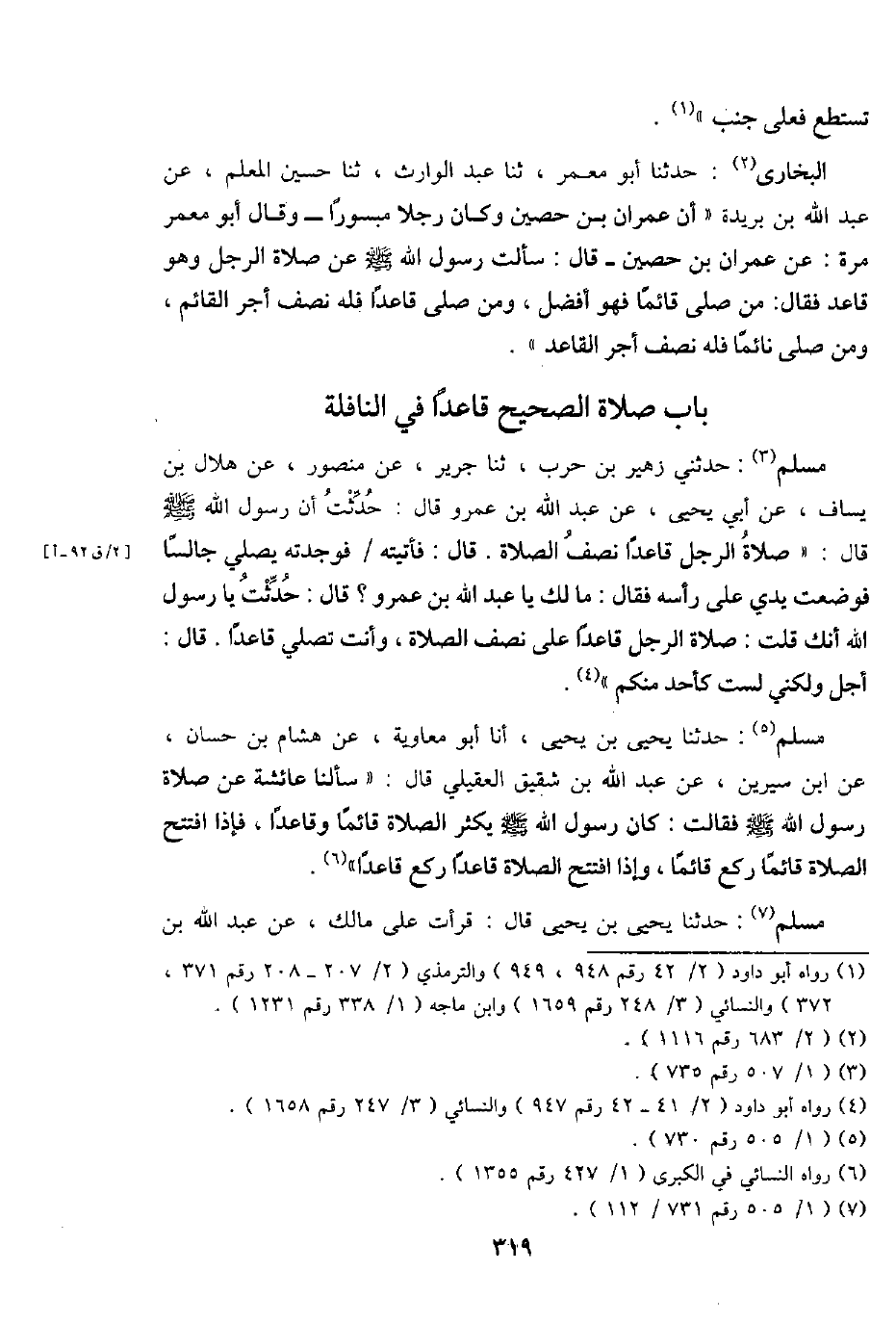 مُسلم: حَدثنِي زُهَيْر بن حَرْب، ثَنَا جرير، عَن مَنْصُور، عَن هِلَال بن يسَاف، عَن أبي يحيى، عَن عبد الله بن عَمْرو قَالَ: حدثت أَن رَسُول اللَّهِ - صَلَّى اللَّهُ عَلَيْهِ وَسَلَّم َ - قَالَ: " صَلَاة الرجل قَاعِدا نصف الصَّلَاة. قَالَ: فَأَتَيْته / فَوَجَدته يُصَلِّي جَالِسا فَوضعت يَدي على رَأسه فَقَالَ: مَا لَك يَا عبد اللَّهِ بن عَمْرو؟ قَالَ: حدثت يَا رَسُول اللَّهِ إِنَّك قلت: صَلَاة الرجل قَاعِدا على نصف الصَّلَاة، وَأَنت تصلي قَاعِدا. قَالَ: أجل وَلَكِنِّي لست كَأحد مِنْكُم ".