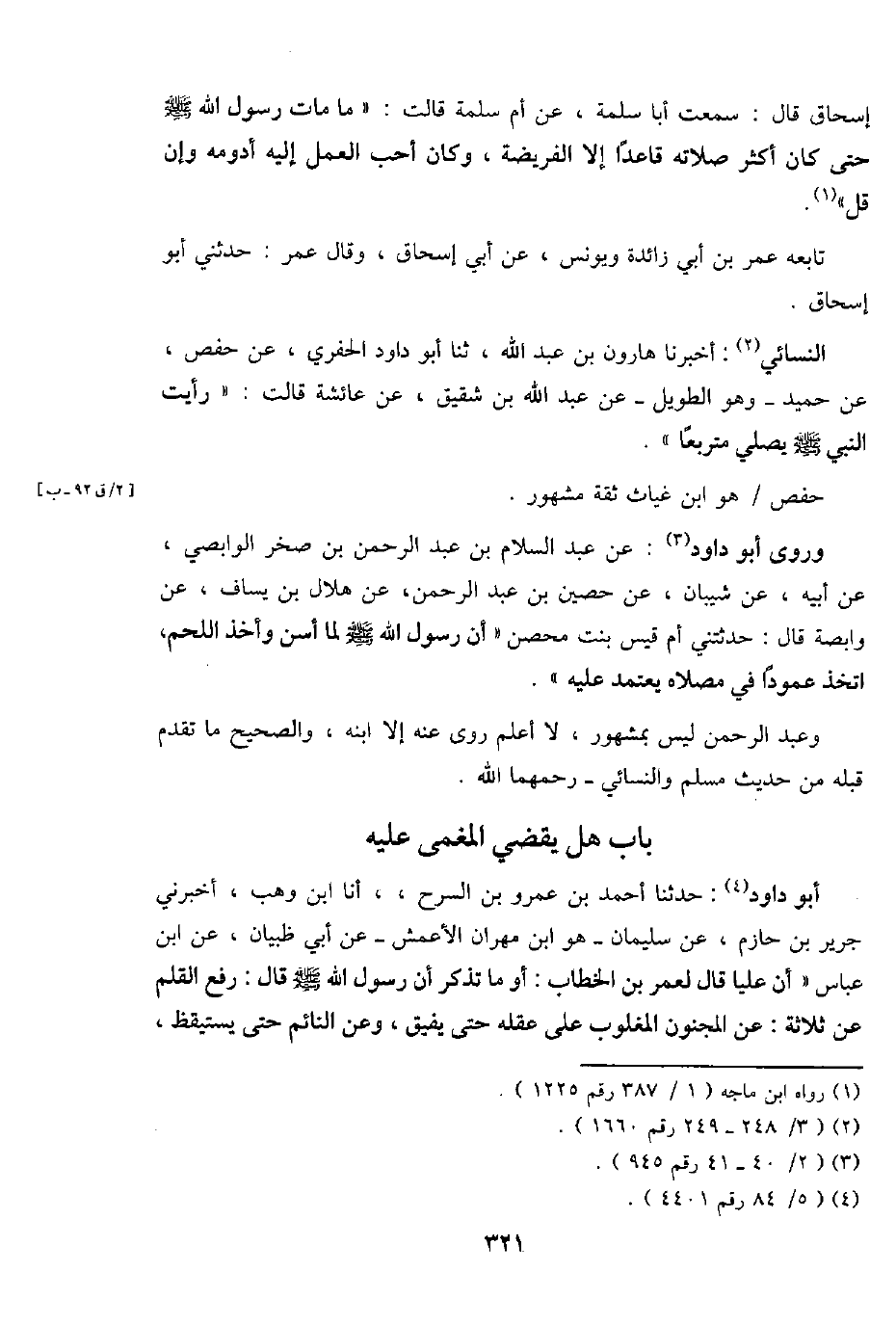 أَبُو دَاوُد: حَدثنَا أَحْمد بن عَمْرو بن السَّرْح،، أَنا ابْن وهب، أَخْبرنِي جرير بن حَازِم، عَن سُلَيْمَان - هُوَ ابْن مهْرَان الْأَعْمَش - عَن أبي ظبْيَان، عَن ابْن عَبَّاس " أَن عليا قَالَ لعمر بن الْخطاب: أَو مَا تذكر أَن رَسُول اللَّهِ - صَلَّى اللَّهُ عَلَيْهِ وَسَلَّم َ - قَالَ: رفع الْقَلَم عَن ثَلَاثَة: عَن الْمَجْنُون المغلوب على عقله حَتَّى يفِيق، وَعَن النَّائِم حَتَّى يَسْتَيْقِظ،