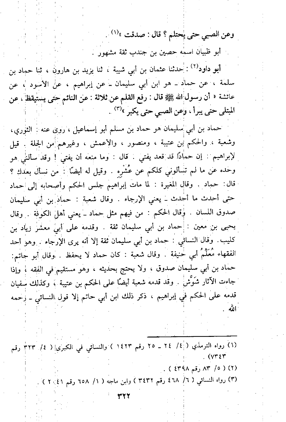 أَبُو دَاوُد: حَدثنَا عُثْمَان بن أبي شيبَة، ثَنَا يزِيد بن هَارُون، ثَنَا حَمَّاد بن سَلمَة، عَن حَمَّاد - هُوَ ابْن أبي سُلَيْمَان - عَن إِبْرَاهِيم، عَن الْأسود، عَن عَائِشَة " أَن رَسُول اللَّهِ - صَلَّى اللَّهُ عَلَيْهِ وَسَلَّم َ - قَالَ: رفع الْقَلَم عَن ثَلَاثَة: عَن النَّائِم حَتَّى يَسْتَيْقِظ، عَن الْمُبْتَلى حَتَّى يبرأ، وَعَن الصَّبِي حَتَّى يكبر ".