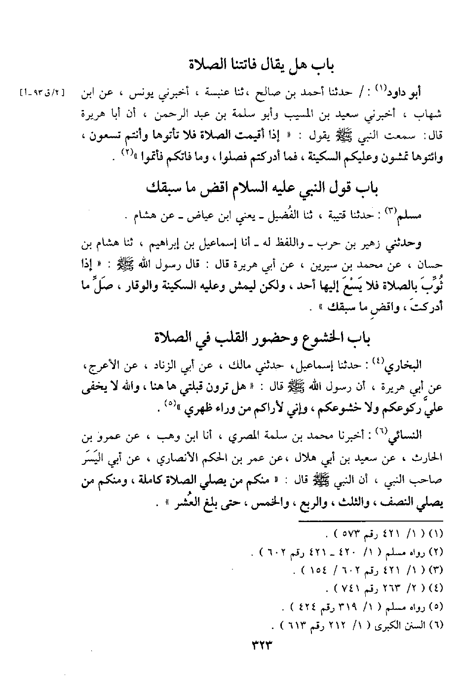 أَبُو دَاوُد: / حَدثنَا أَحْمد بن صَالح، ثَنَا عَنْبَسَة، أَخْبرنِي يُونُس، عَن ابْن شهَاب، أَخْبرنِي سعيد بن الْمسيب وَأَبُو سَلمَة بن عبد الرَّحْمَن، أَن أَبَا هُرَيْرَة قَالَ: سَمِعت النَّبِي - صَلَّى اللَّهُ عَلَيْهِ وَسَلَّم َ - يَقُول: " إِذا أُقِيمَت الصَّلَاة فَلَا تأتوها وَأَنْتُم تسعون، وائتوها تمشون وَعَلَيْكُم السكينَة، فَمَا أدركتم فصلوا، وَمَا فاتكم فَأتمُّوا ".