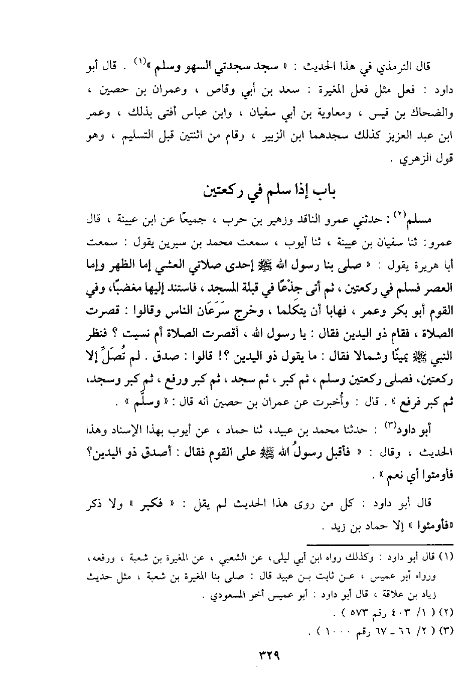 مُسلم: حَدثنِي عَمْرو النَّاقِد وَزُهَيْر بن حَرْب، جَمِيعًا عَن ابْن عُيَيْنَة، قَالَ عَمْرو: ثَنَا سُفْيَان بن عُيَيْنَة، ثَنَا أَيُّوب، سَمِعت مُحَمَّد بن سِيرِين يَقُول: سَمِعت أَبَا هُرَيْرَة يَقُول: " صلى بِنَا رَسُول اللَّهِ - صَلَّى اللَّهُ عَلَيْهِ وَسَلَّم َ - إِحْدَى صَلَاتي الْعشي إِمَّا الظّهْر وَإِمَّا الْعَصْر فَسلم فِي رَكْعَتَيْنِ، ثمَّ أَتَى جذعا فِي قبْلَة الْمَسْجِد، فاستند إِلَيْهَا مغضبا، وَفِي الْقَوْم أَبُو بكر وَعمر، فَهَابَا أَن يتكلما، وَخرج سرعَان النَّاس وَقَالُوا: قصرت الصَّلَاة، فَقَامَ ذُو الْيَدَيْنِ فَقَالَ: يَا رَسُول اللَّهِ، أقصرت الصَّلَاة أم نسيت؟ فَنظر النَّبِي - صَلَّى اللَّهُ عَلَيْهِ وَسَلَّم َ - يَمِينا وَشمَالًا فَقَالَ: مَا يَقُول ذُو الْيَدَيْنِ؟ ! قَالُوا: صدق. لم تصل إِلَّا رَكْعَتَيْنِ، فصلى رَكْعَتَيْنِ وَسلم، ثمَّ كبر، ثمَّ سجد، ثمَّ كبر وَرفع، ثمَّ كبر وَسجد، ثمَّ كبر فَرفع ". قَالَ: وأخبرت عَن عمرَان بن حُصَيْن أَنه قَالَ: " وَسلم ".