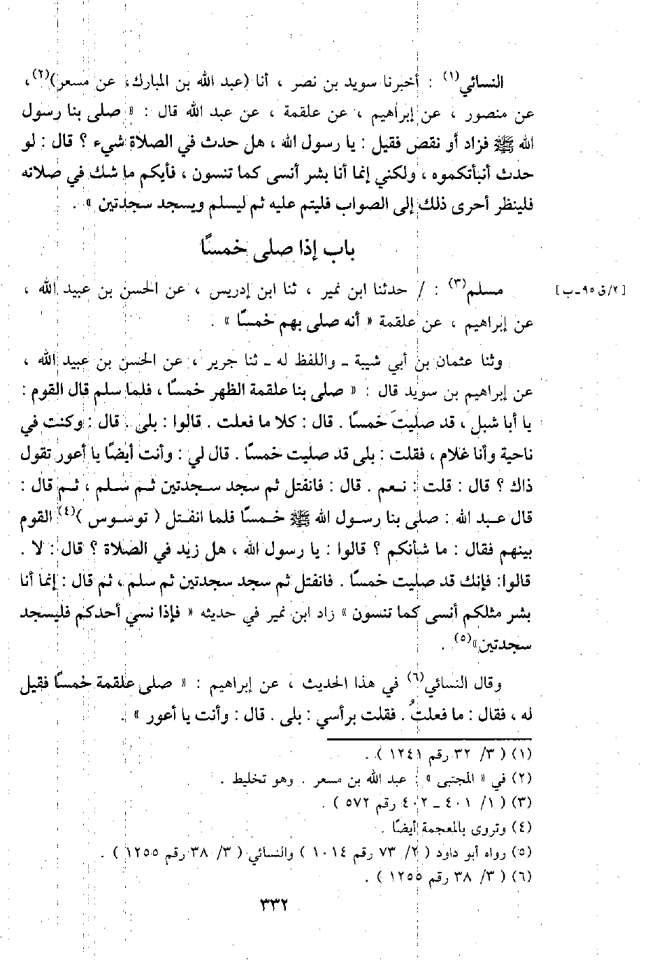 النَّسَائِيّ: أخبرنَا سُوَيْد بن نصر، أَنا (عبد اللَّهِ بن الْمُبَارك، عَن مسعر) ، عَن مَنْصُور، عَن إِبْرَاهِيم، عَن عَلْقَمَة، عَن عبد اللَّهِ قَالَ: " صلى بِنَا رَسُول اللَّهِ - صَلَّى اللَّهُ عَلَيْهِ وَسَلَّم َ - فَزَاد أَو نقص فَقيل: يَا رَسُول اللَّهِ، هَل حدث فِي الصَّلَاة شَيْء؟ قَالَ: لَو حدث أنبأتكموه، وَلَكِنِّي إِنَّمَا أَنا بشر أنسى كَمَا تنسون، فَأَيكُمْ مَا شكّ فِي صلَاته فَلْينْظر أَحْرَى ذَلِك إِلَى الصَّوَاب فليتم عَلَيْهِ ثمَّ ليسلم وَيسْجد سَجْدَتَيْنِ ".