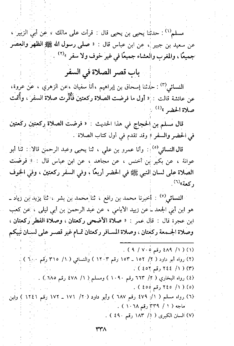 النَّسَائِيّ: حَدثنَا إِسْحَاق بن إِبْرَاهِيم، أَنا سُفْيَان، عَن الزُّهْرِيّ، عَن عُرْوَة، عَن عَائِشَة قَالَت: " أول مَا فرضت الصَّلَاة رَكْعَتَيْنِ فأقرت صَلَاة السّفر، وأتمت صَلَاة الْحَضَر ".