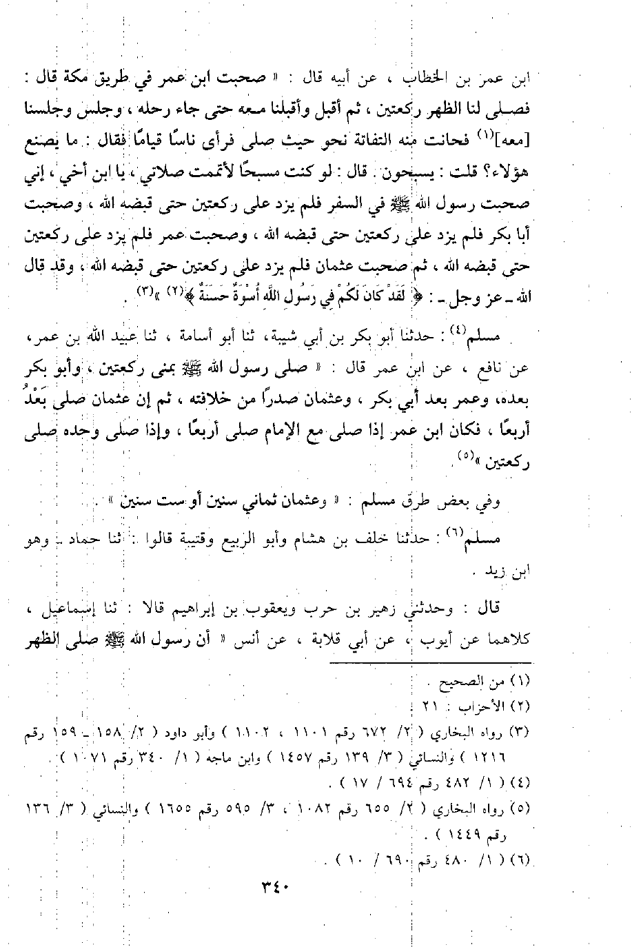 ابْن عمر بن الْخطاب، عَن أَبِيه قَالَ: " صَحِبت ابْن عمر فِي طَرِيق مَكَّة قَالَ: فصلى لنا الظّهْر رَكْعَتَيْنِ، ثمَّ أقبل وأقبلنا مَعَه حَتَّى جَاءَ رَحْله، وَجلسَ وَجَلَسْنَا [مَعَه] فحانت مِنْهُ التفاته نَحْو حَيْثُ صلى فَرَأى نَاسا قيَاما فَقَالَ: مَا يصنع هَؤُلَاءِ؟ قلت: يسبحون. قَالَ: لَو كنت مسبحا لأتممت صَلَاتي، يَا ابْن أخي، إِنِّي صَحِبت رَسُول الله - صَلَّى اللَّهُ عَلَيْهِ وَسَلَّم َ - فِي السّفر فَلم يزدْ على الرَّكْعَتَيْنِ حَتَّى قَبضه اللَّهِ، وصحبت أَبَا بكر فَلم يزدْ على رَكْعَتَيْنِ حَتَّى قَبضه اللَّهِ، وصحبت عمر فَلم يزدْ على رَكْعَتَيْنِ حَتَّى قَبضه اللَّهِ، ثمَّ صَحِبت عُثْمَان فَلم يزدْ على رَكْعَتَيْنِ حَتَّى قَبضه اللَّهِ، وَقد قَالَ اللَّهِ - عز وَجل -: {لقد كَانَ لكم فِي رَسُول اللَّهِ أُسْوَة حَسَنَة} ".