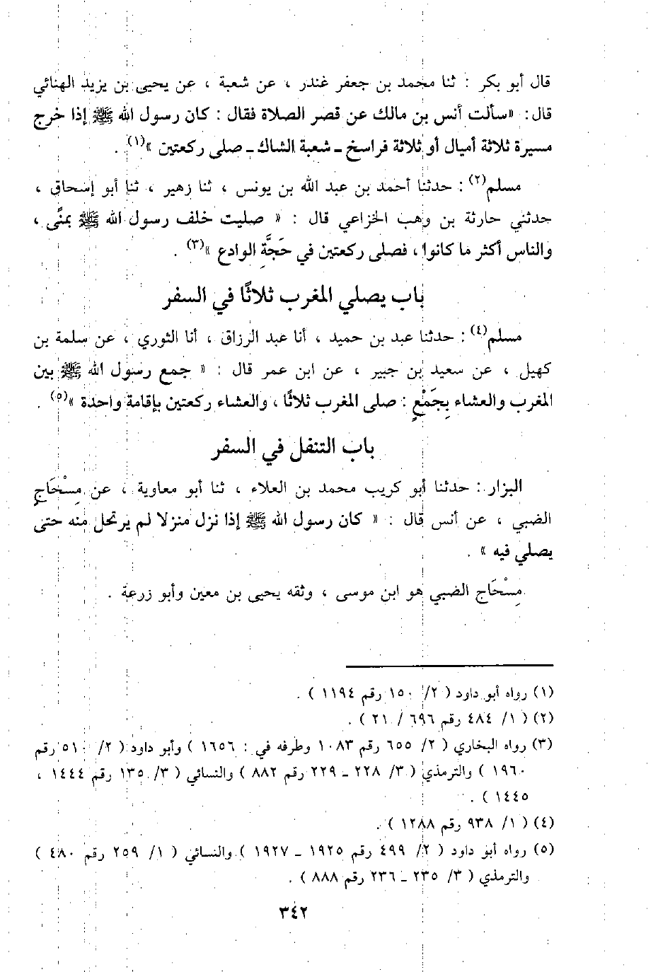 الْبَزَّار: حَدثنَا أَبُو كريب مُحَمَّد بن الْعَلَاء، ثَنَا أَبُو مُعَاوِيَة، عَن مسحاج الضَّبِّيّ، عَن أنس قَالَ: " كَانَ رَسُول اللَّهِ - صَلَّى اللَّهُ عَلَيْهِ وَسَلَّم َ - إِذا نزل منزلا لم يرتحل مِنْهُ حَتَّى يُصَلِّي فِيهِ ".