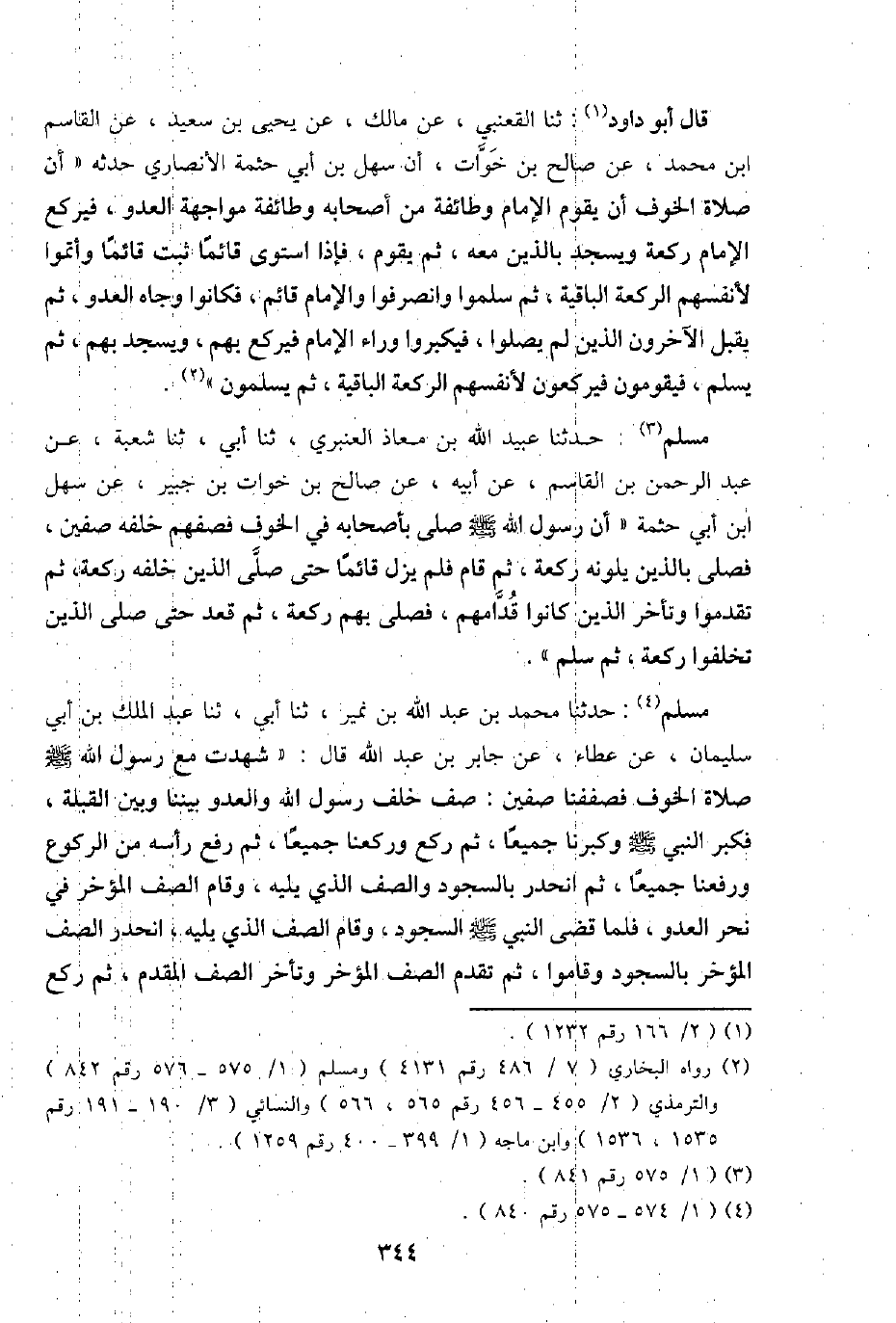 مُسلم: حَدثنَا عبيد اللَّهِ بن معَاذ الْعَنْبَري، ثَنَا أبي، ثَنَا شُعْبَة، عبد الرَّحْمَن بن الْقَاسِم، عَن أَبِيه، عَن صَالح بن خَوات بن جُبَير، عَن سهل ابْن أبي حثْمَة " أَن رَسُول اللَّهِ - صَلَّى اللَّهُ عَلَيْهِ وَسَلَّم َ - صلى بِأَصْحَابِهِ فِي الْخَوْف فصفهم خَلفه صفّين، فصلى بالذين يلونه رَكْعَة، ثمَّ قَامَ فَلم يزل قَائِما حَتَّى صلى الَّذين خلقه رَكْعَة، ثمَّ تقدمُوا وَتَأَخر الَّذين كَانُوا قدامهم، فصلى بهم رَكْعَة، ثمَّ قعد حَتَّى صلى الَّذين تخلفوا رَكْعَة، ثمَّ سلم ".