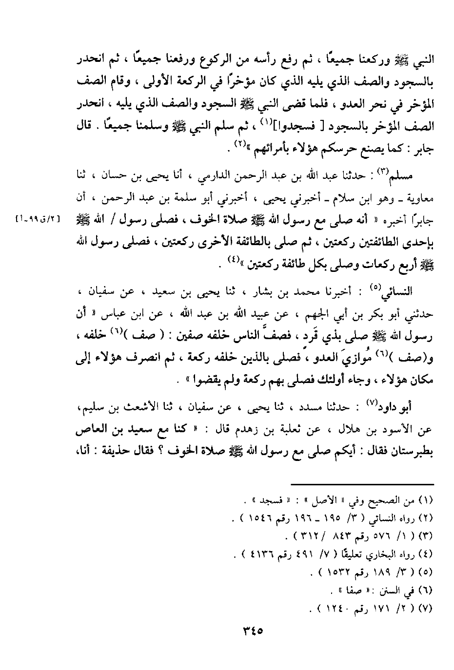 مُسلم: حَدثنَا عبد اللَّهِ بن عبد الرَّحْمَن الدَّارمِيّ، أَنا يحيى بن حسان، ثَنَا مُعَاوِيَة - وَهُوَ ابْن سَلام - أَخْبرنِي يحيى، أَخْبرنِي أَبُو سَلمَة بن عبد الرَّحْمَن، أَن جَابِرا أخبرهُ " أَنه صلى مَعَ رَسُول اللَّهِ - صَلَّى اللَّهُ عَلَيْهِ وَسَلَّم َ - صَلَاة الْخَوْف، فصلى رَسُول / اللَّهِ - صَلَّى اللَّهُ عَلَيْهِ وَسَلَّم َ - بِإِحْدَى الطَّائِفَتَيْنِ رَكْعَتَيْنِ، ثمَّ صلى بالطائفة الْأُخْرَى رَكْعَتَيْنِ، فصلى رَسُول اللَّهِ - صَلَّى اللَّهُ عَلَيْهِ وَسَلَّم َ - أَربع رَكْعَات وَصلى بِكُل طَائِفَة رَكْعَتَيْنِ ".